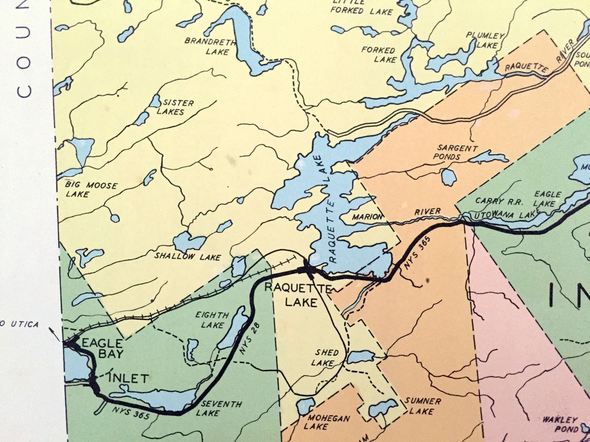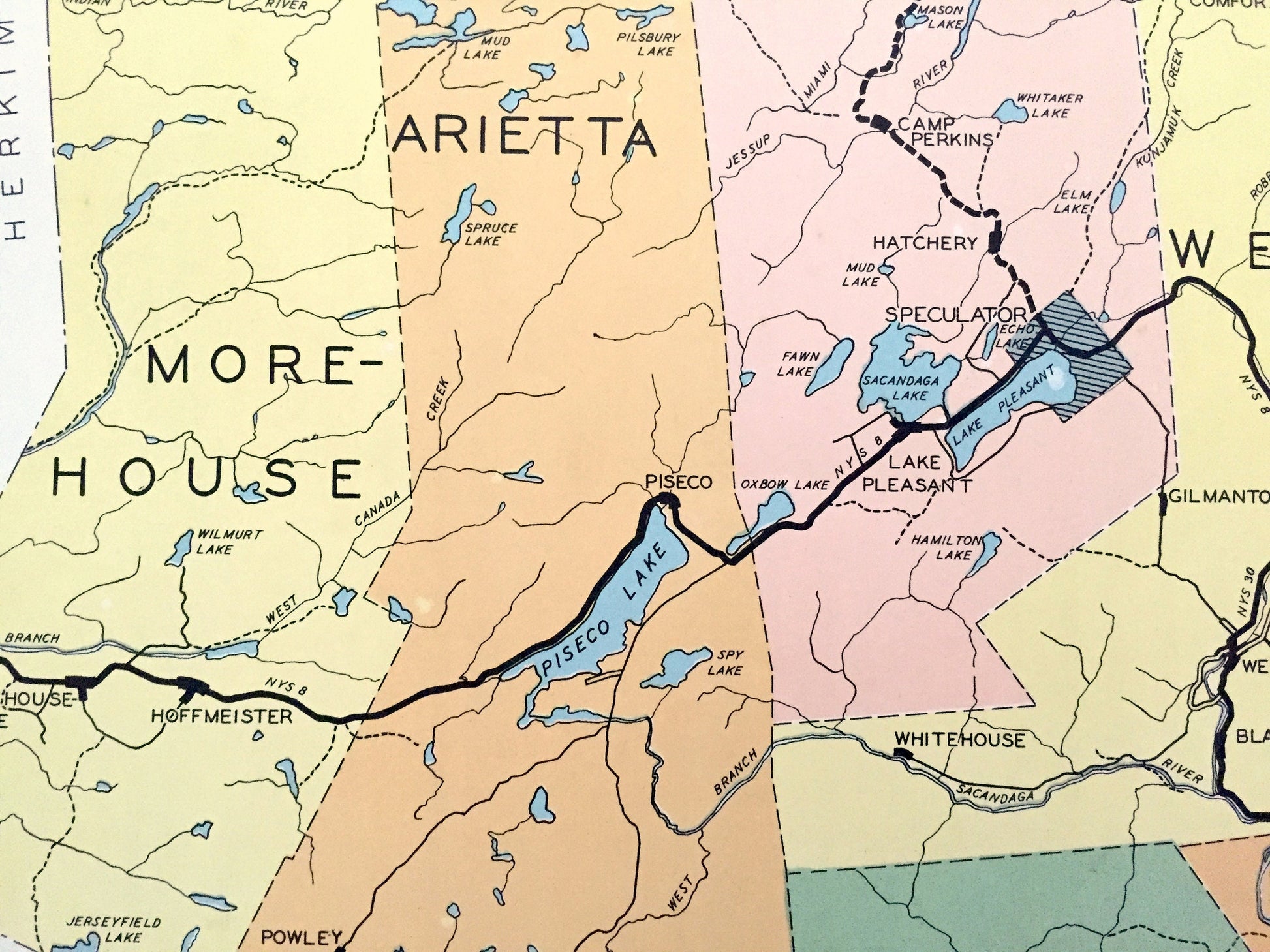 Points of Interest: Raquet Lake, Little Tupper Lake, Long Lake, Fulton Chain Lakes, Indian Lake, Round Pond, Sacandaga Lake, Lake Pleasant, Piseco Lake, , Sacandaga River, Utowana Lake, Eagle Lake, Raquette River and many more ponds, lakes, creeks, rivers, roads, highways, railroads, school houses and elevations.