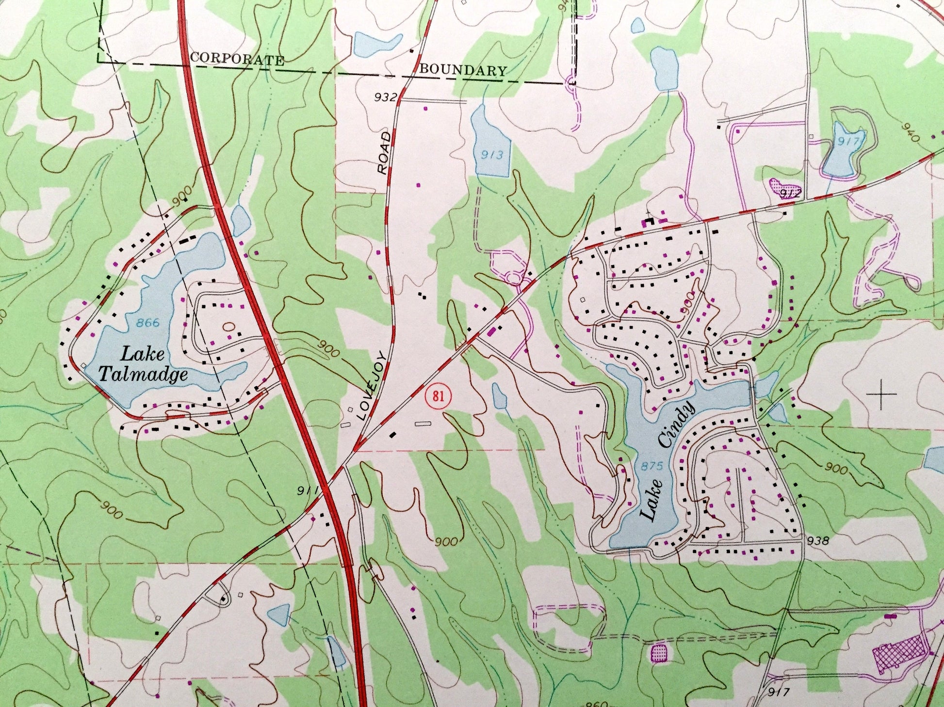 Points of Interest: Clayton County, Henry County, Atlanta International Raceway (Atlanta Motor Speedway), Bear Creek Airport, Shamrock Lake, Lake Talmadge, Lake Cindy, Walnut Creek, Pates Creek, Club Lake, Lake Twelve Oaks, Lake Amah Lee, Towaliga River, Camp Calvin, Bates Creek and lots more creeks, houses, schools, churches, train tracks and roads.