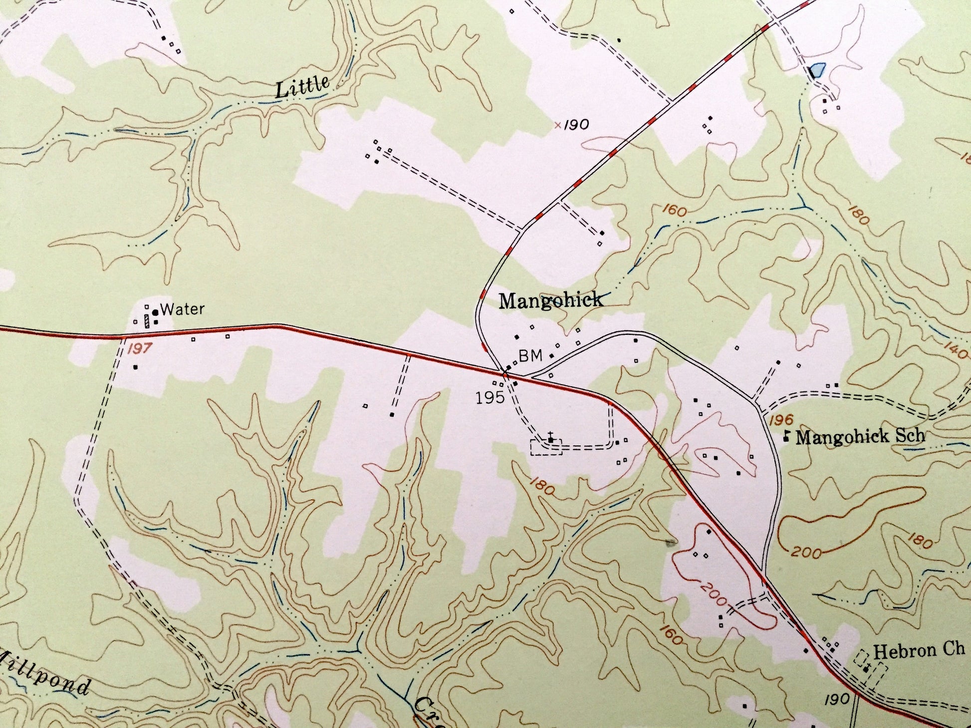 Points of Interest: Pamunkey River, Hornquarter Creek, Huckleberry Pond, Ballards Pond, Herring Creek, Dorrell Creek, and many more hills, streams, ponds, houses, schools, churches and roads.
