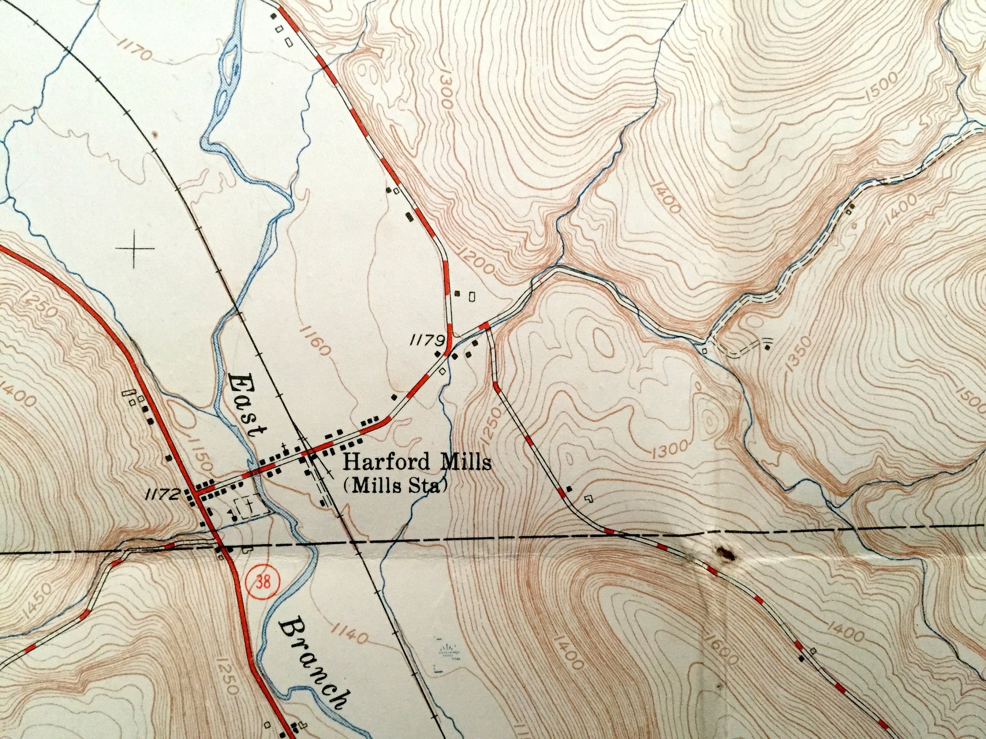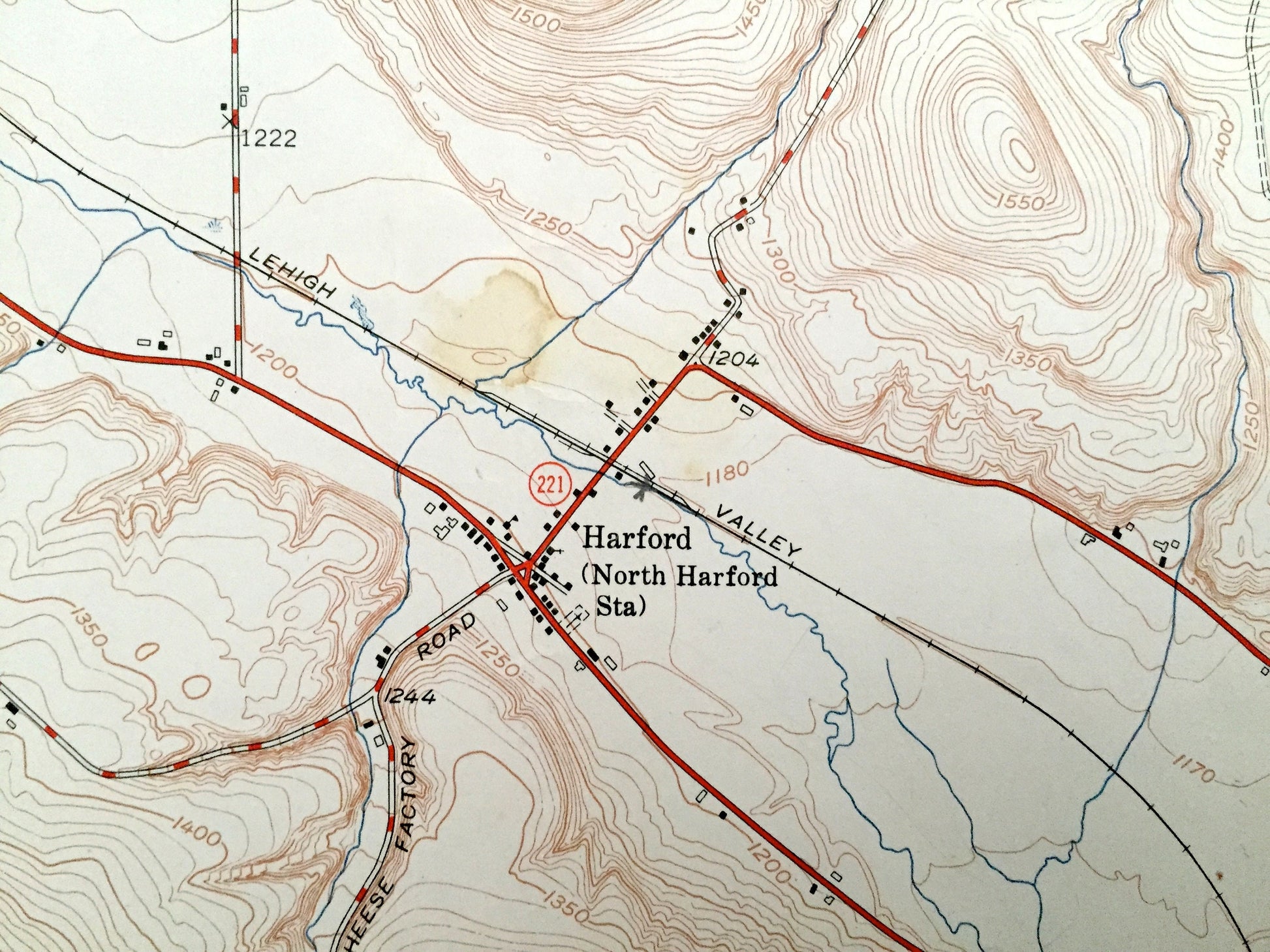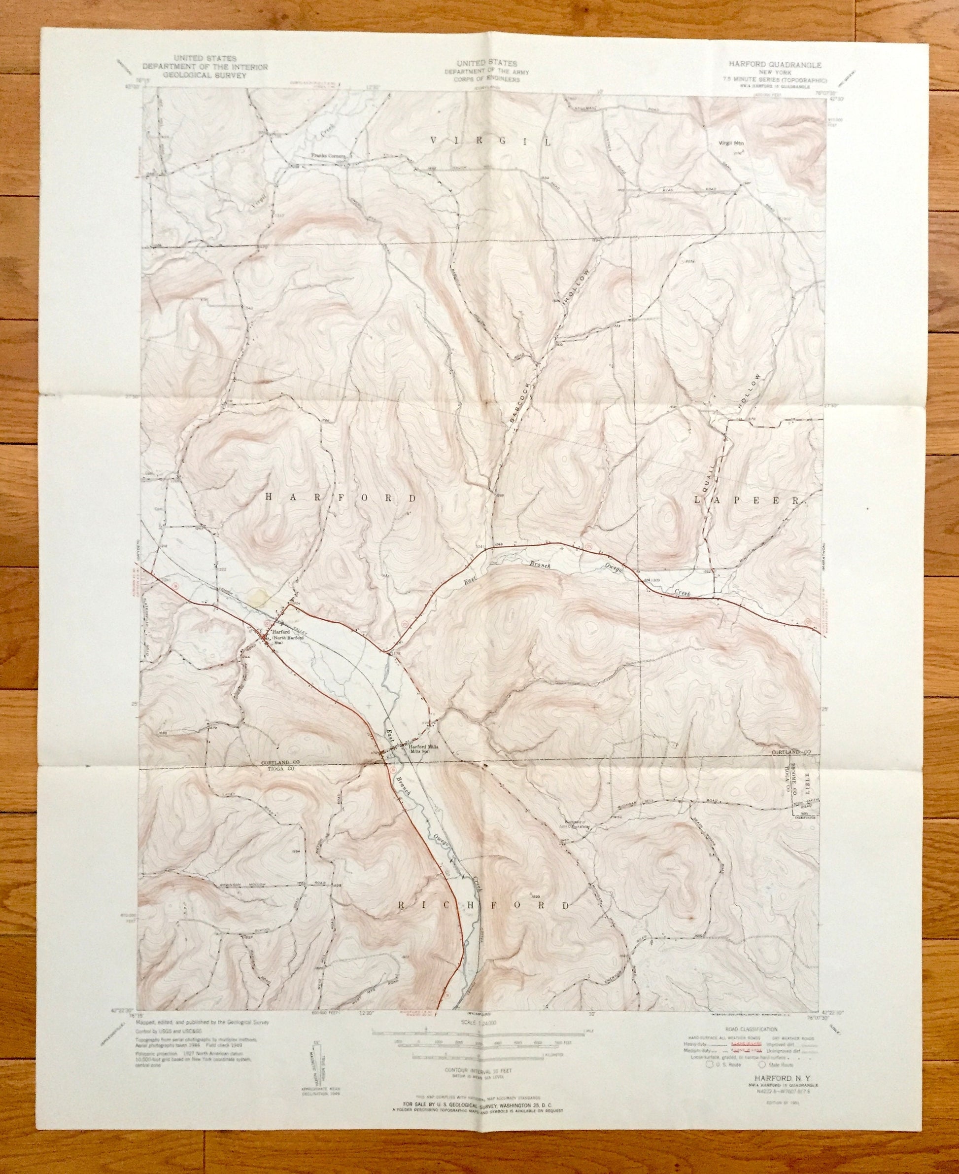 Beautiful, antique map of Harford, New York and surrounding Cortland and Tioga County area. This is an authentic 1951 print from the U.S. Geological Survey and NOT a computer reproduction.