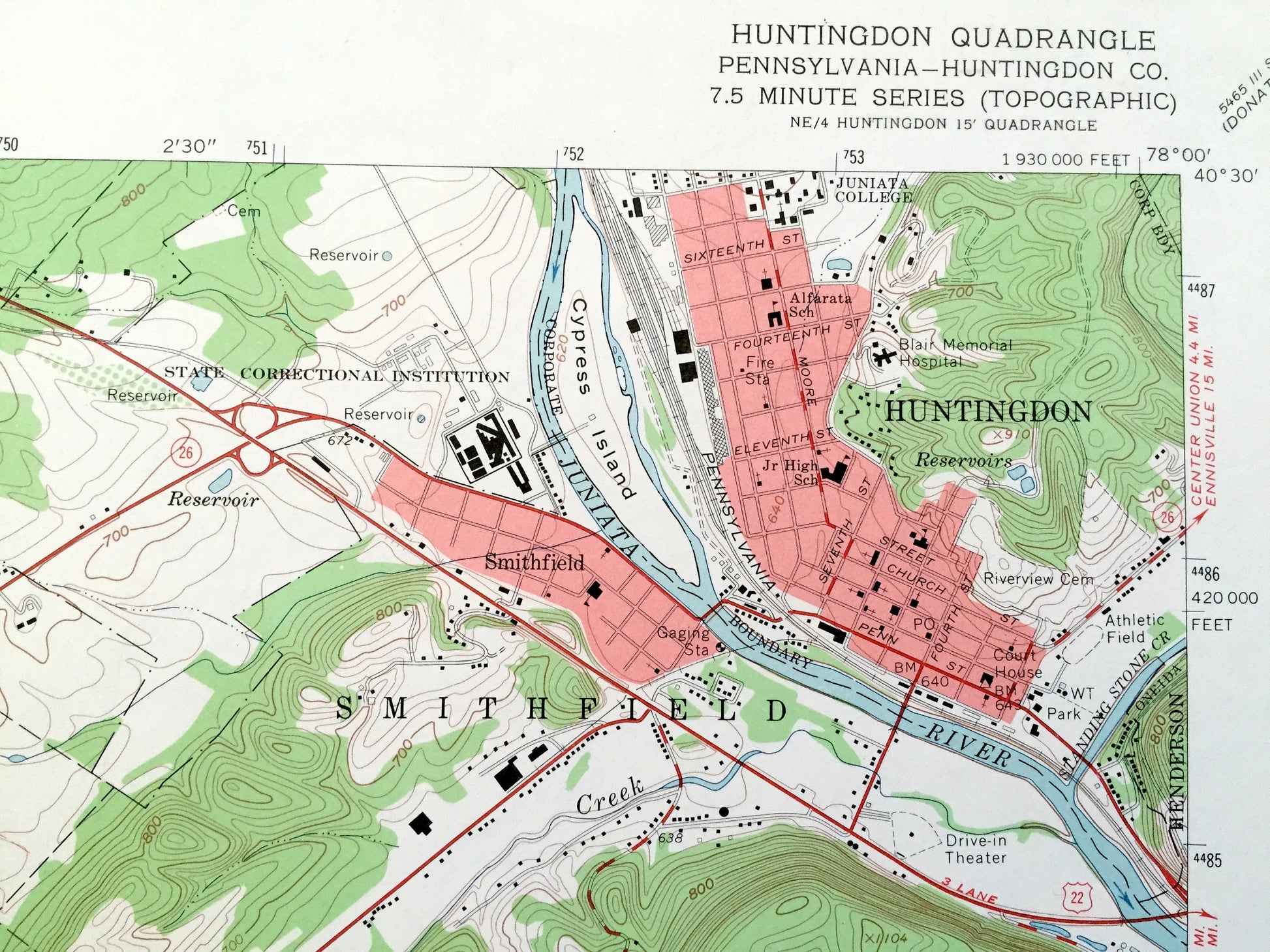 Beautiful, antique map of Huntingdon, Pennsylvania and surrounding Huntingdon County area. This is an authentic 1963 edition, 1965 print from the U.S. Geological Survey and NOT a computer reproduction.
