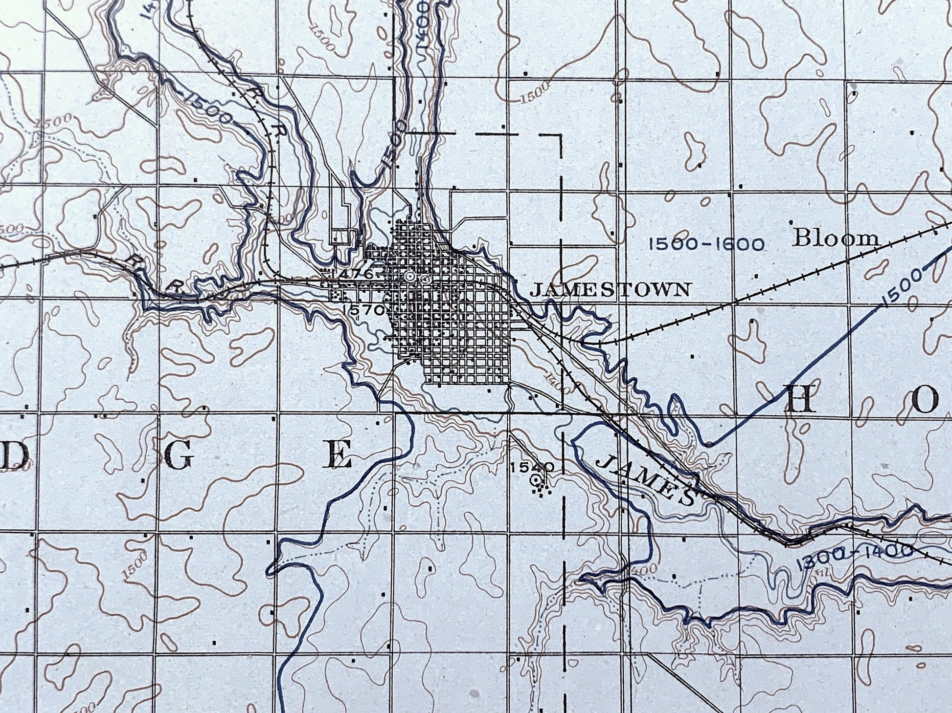 Beautiful, antique "Artesian Water" map of Jamestown, North Dakota and surrounding Stutsman County and Lamoure County area. This is an authentic 1909 edition, 1909 print from the U.S. Geological Survey and NOT a computer reproduction.