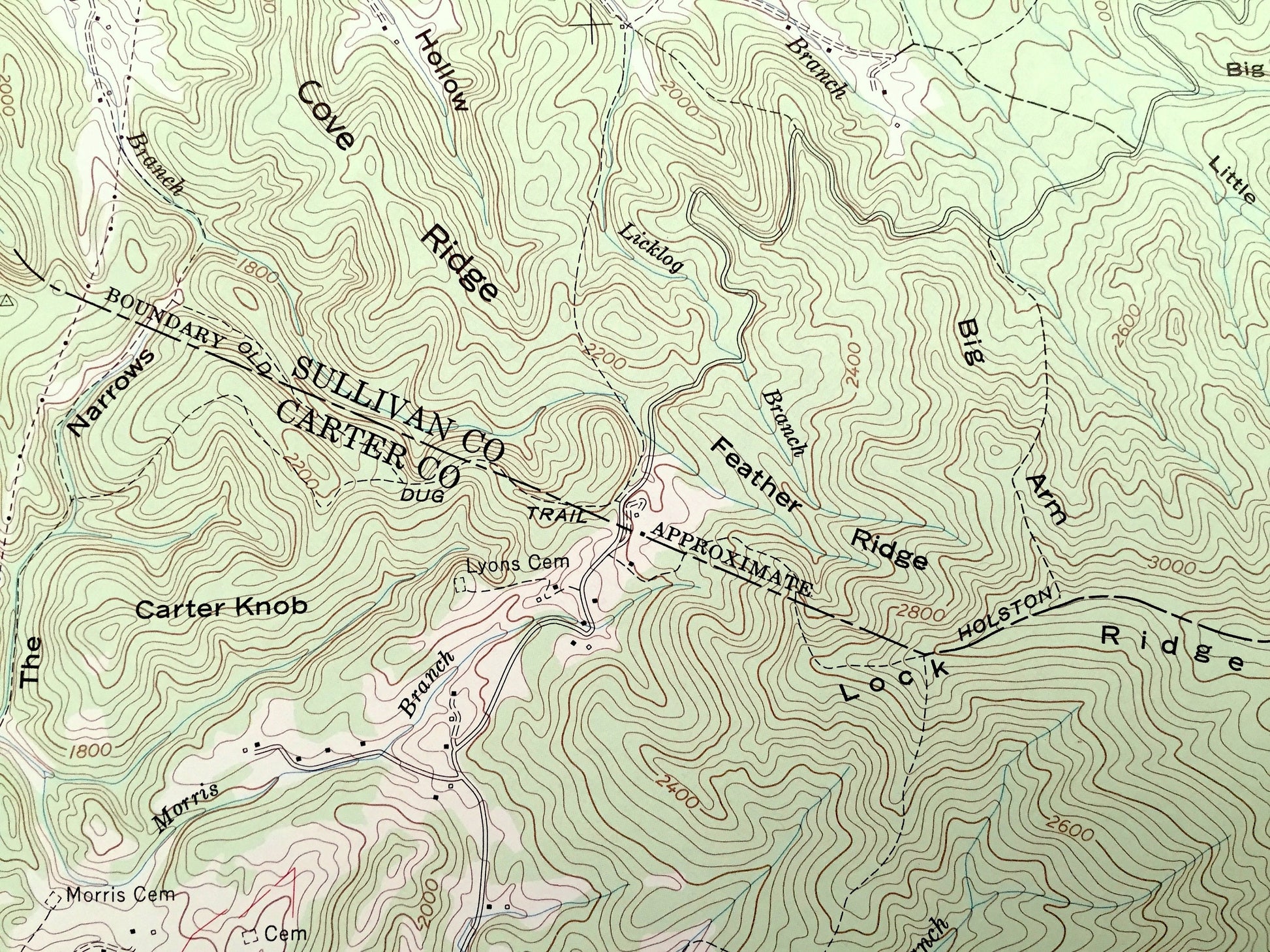 Points of Interest: Carter County, Sullivan County, Cherokee National Forest, Holston River, Holston Mountain, Boone Lake, Grandfather Knob, Morrell Cave, Weavers Arm Hollow, Little Stony Gap, Cannon Place Gap, Chestnut Flats, Watauga Valley, and lots more hills, mountains, creeks, ponds, brooks, towns, schools, churches, roads and railroads.