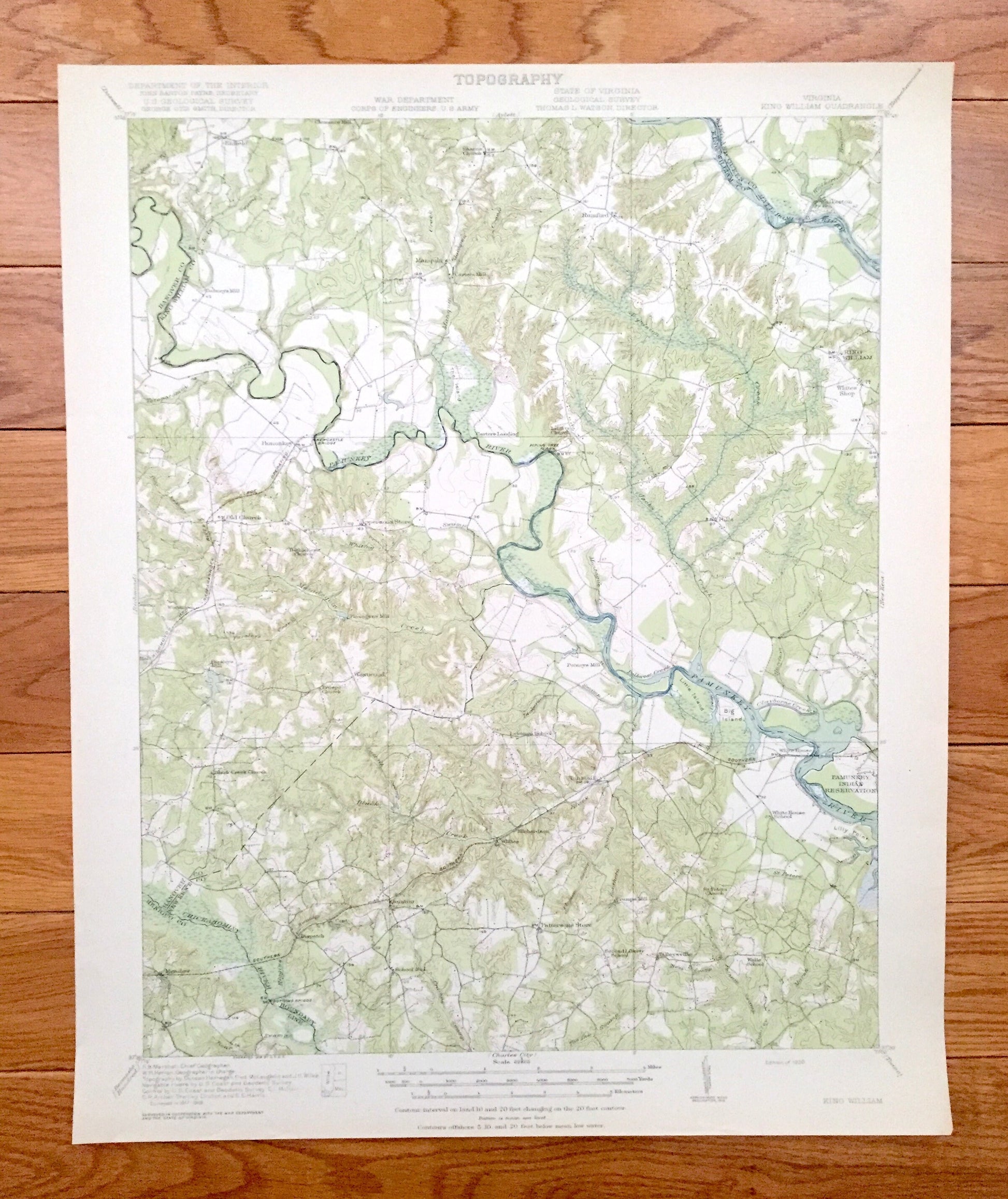 Beautiful, antique map of historic King William, Virginia and surrounding King William County, King and Queen County, Hanover County, New Kent County & Henrico County areas. This is an authentic 1920 print from the U.S. Geological Survey and NOT a computer reproduction.