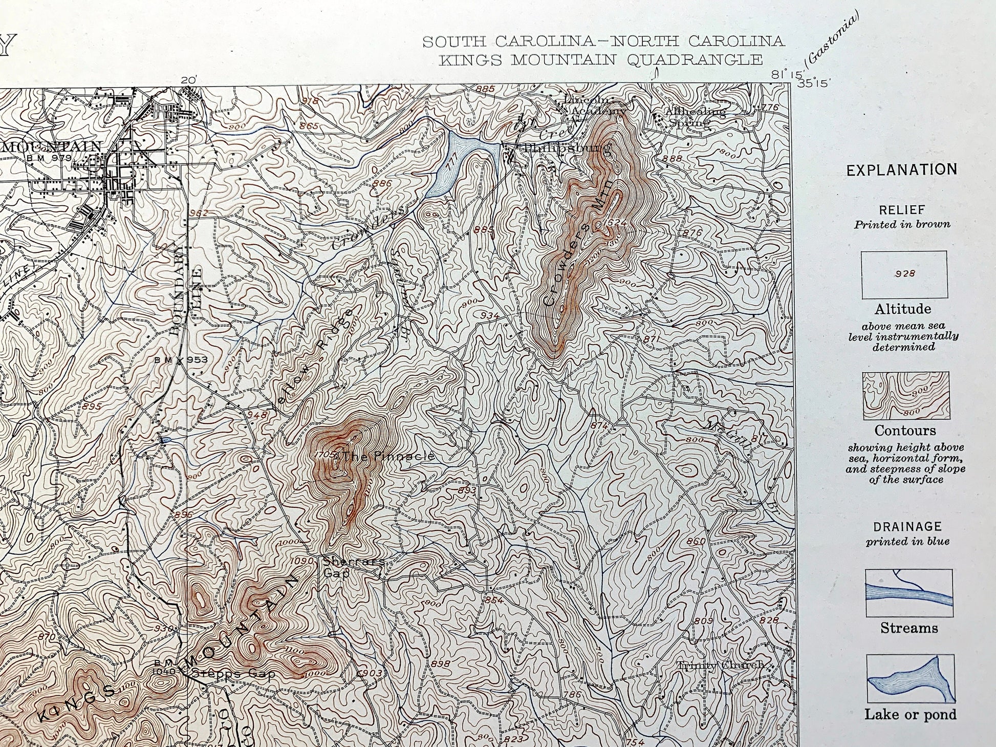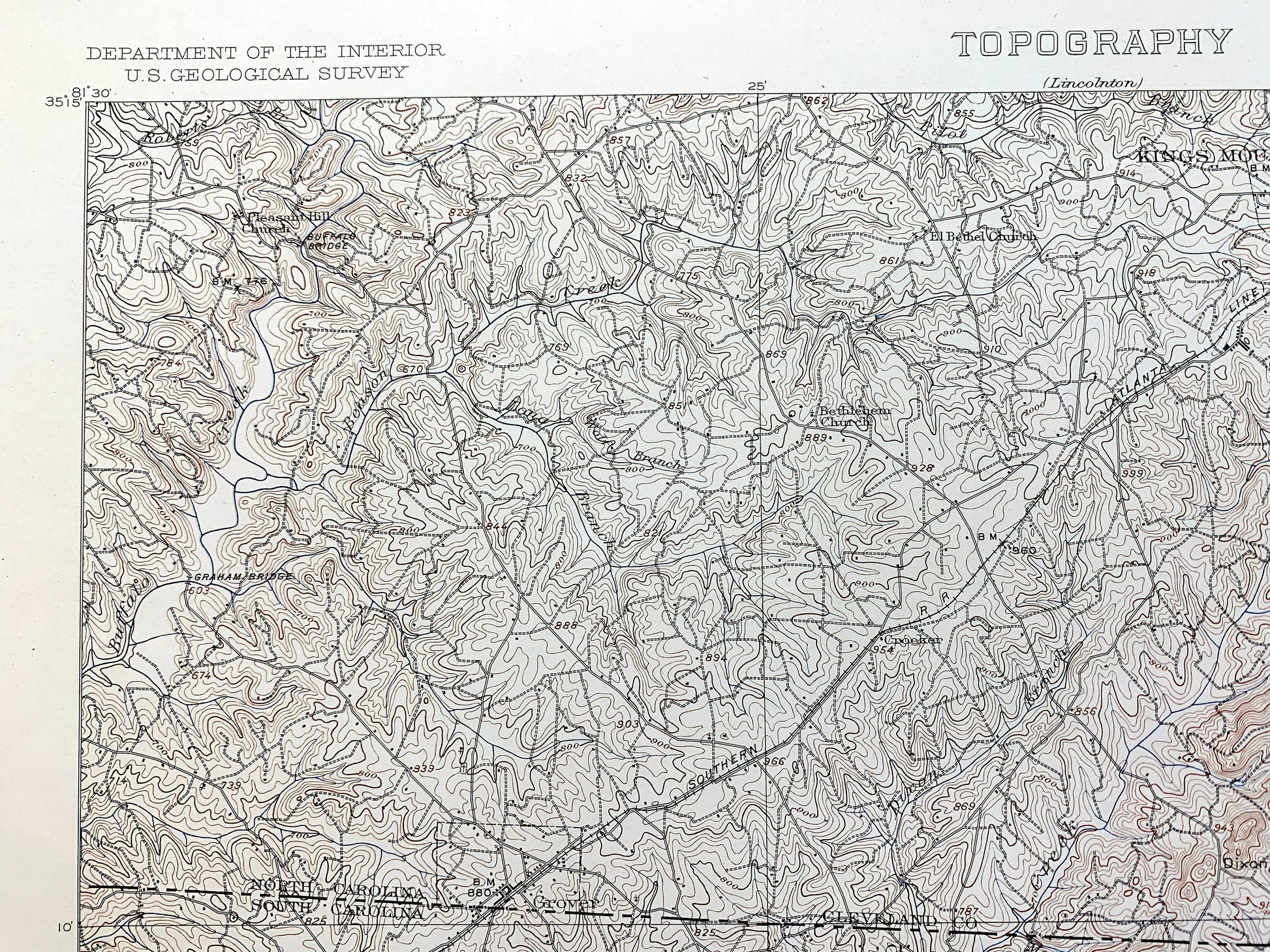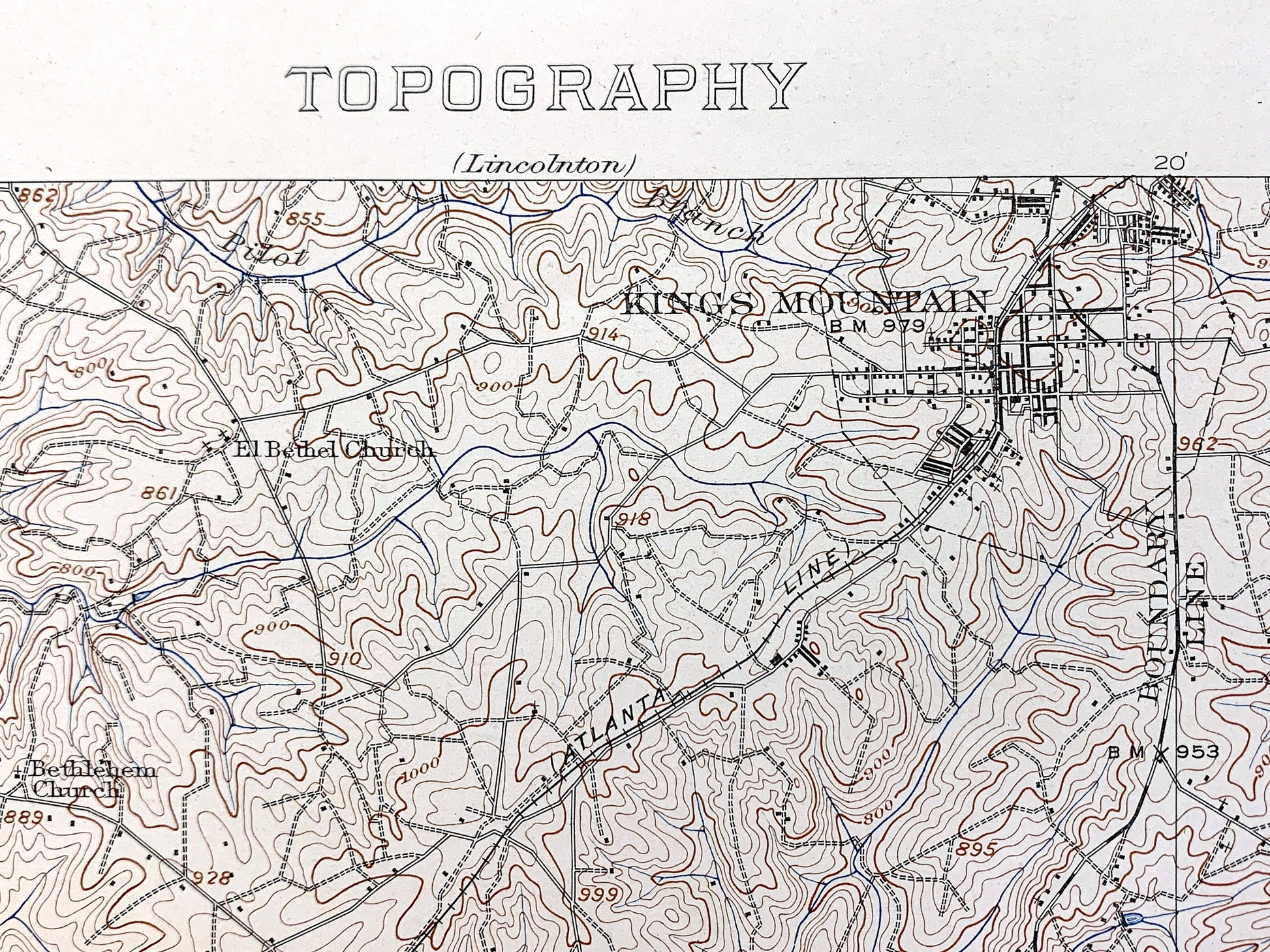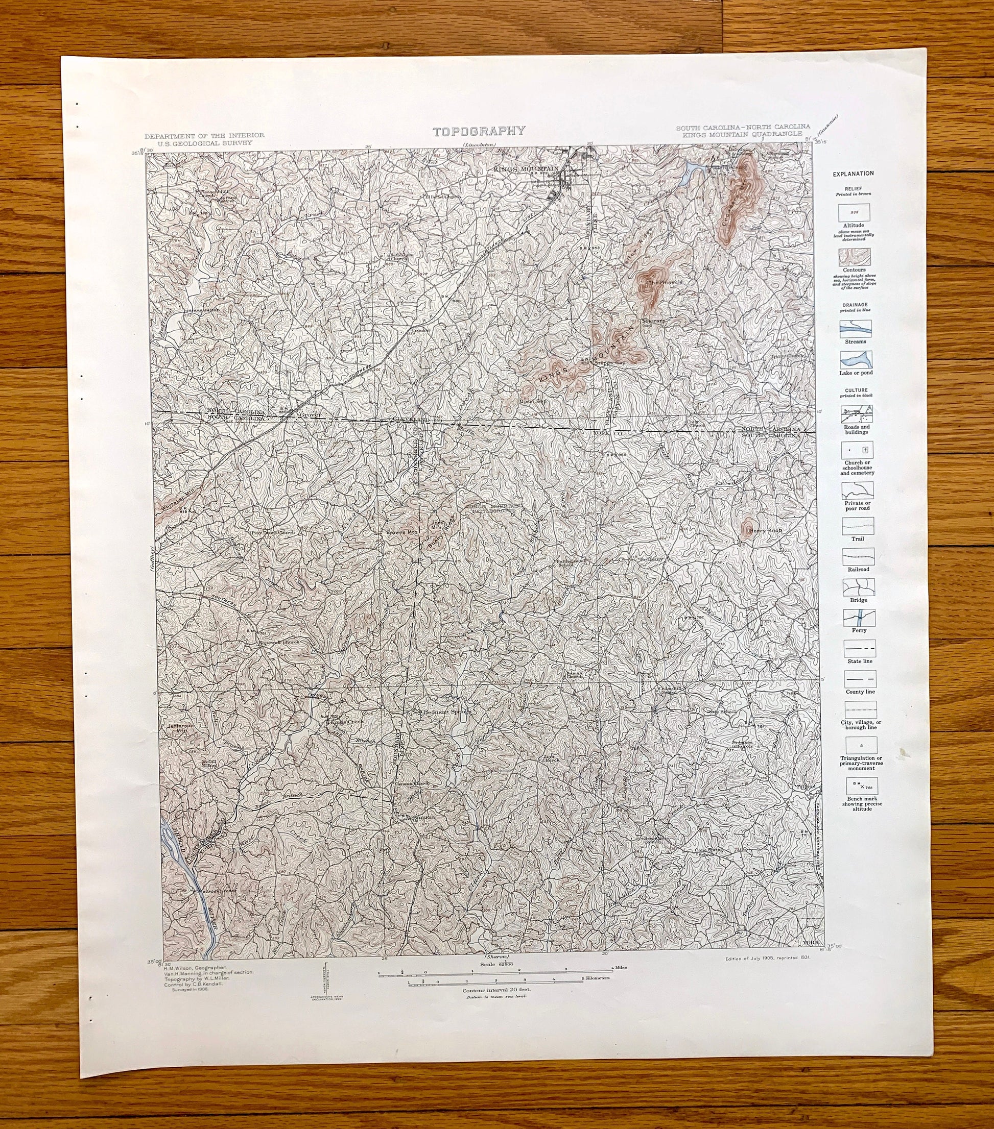 Beautiful, antique map of Kings Mountain, South Carolina and surrounding Cleveland County and Gaston County (NC), Cherokee County and York County (SC) areas. This is an authentic 1908 edition, 1931 print from the U.S. Geological Survey and NOT a computer reproduction. It is from a Geologic Atlas folio.