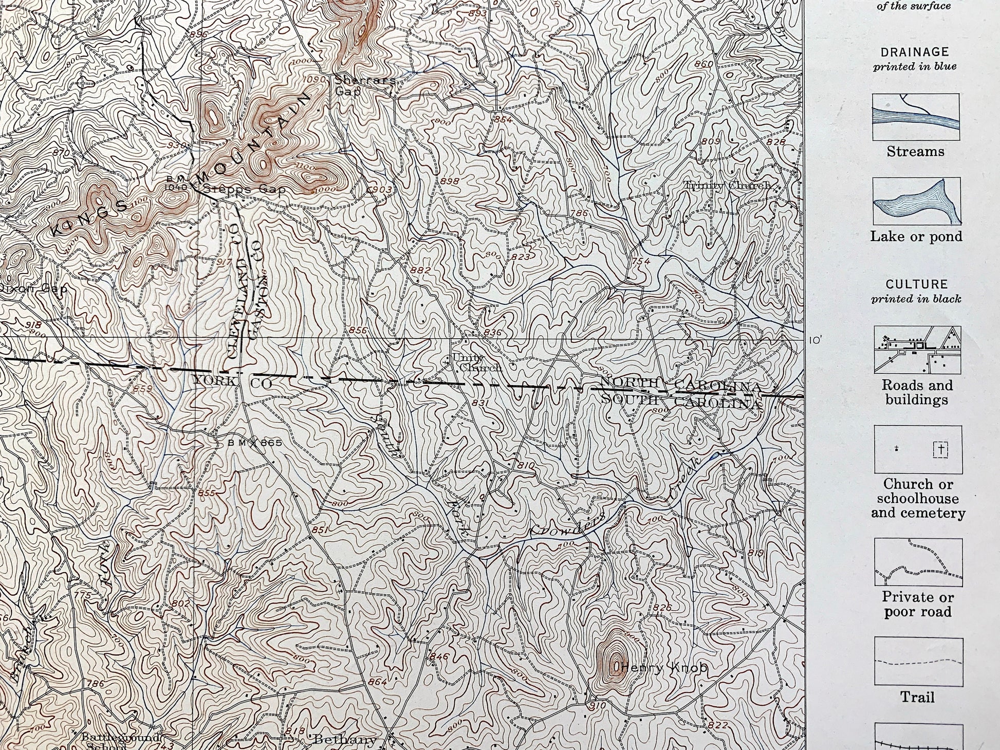 Points of Interest: Cleveland County and Gaston County (NC), Cherokee County and York County (SC), Broad River, Kings Creek, Wolf Creek, Buffalo Creek, Kings Mountain, Crowders Mountain, Yellow Ridge, Crowders Creek, Bullocks Creek, Turkey Creek, Kings Mountain Battleground, and many more towns, houses, roads, train tracks and creeks.