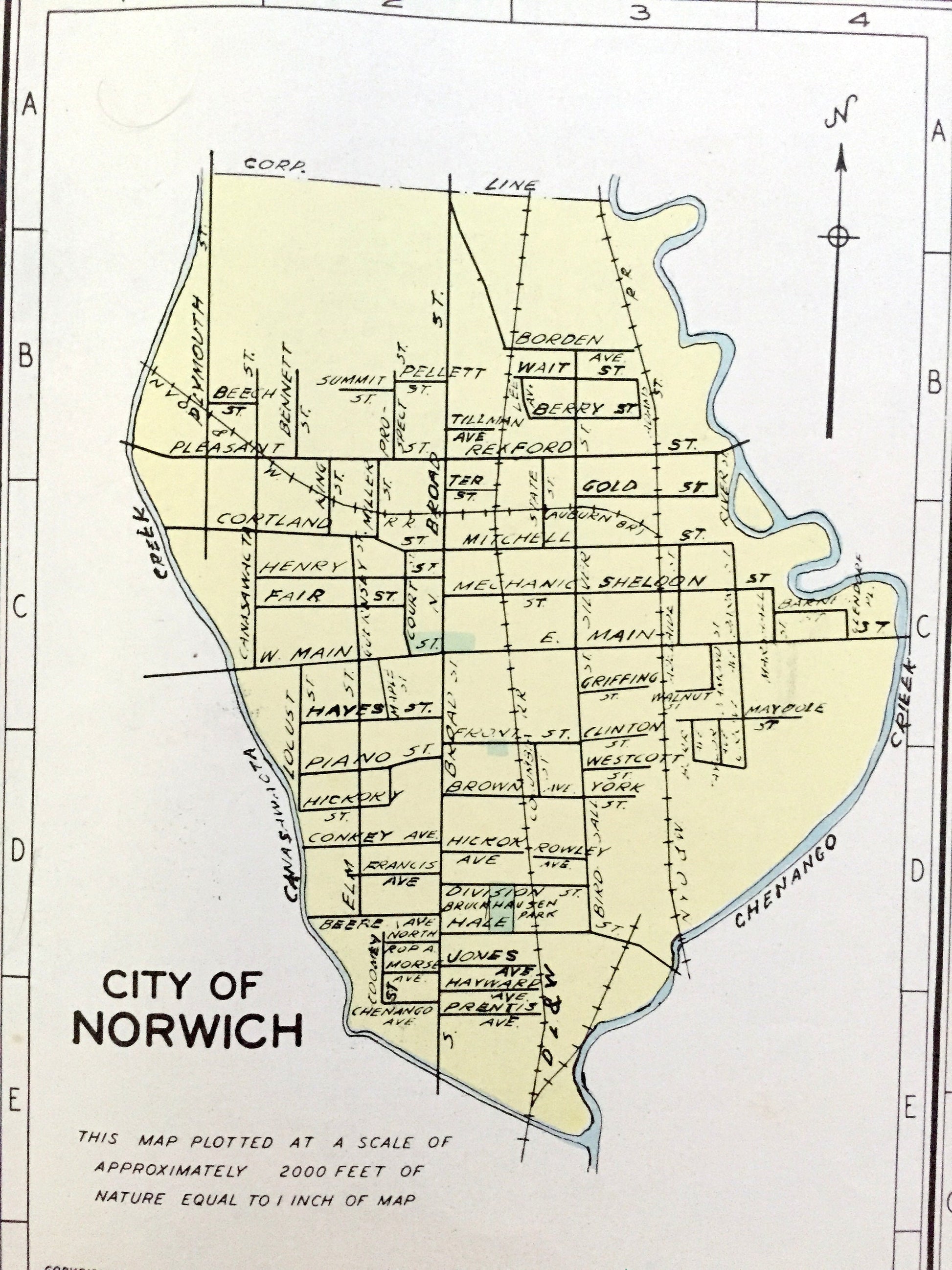 Beautiful, antique street map of the cities of Kingston, Newburgh, Norwich, Beacon & Ithaca, New York. This is an authentic print taken from the rare "Historical Atlas of New York State" by William P. Munger, published by Frank E. Richards Co. in 1941, and is NOT a computer reproduction.