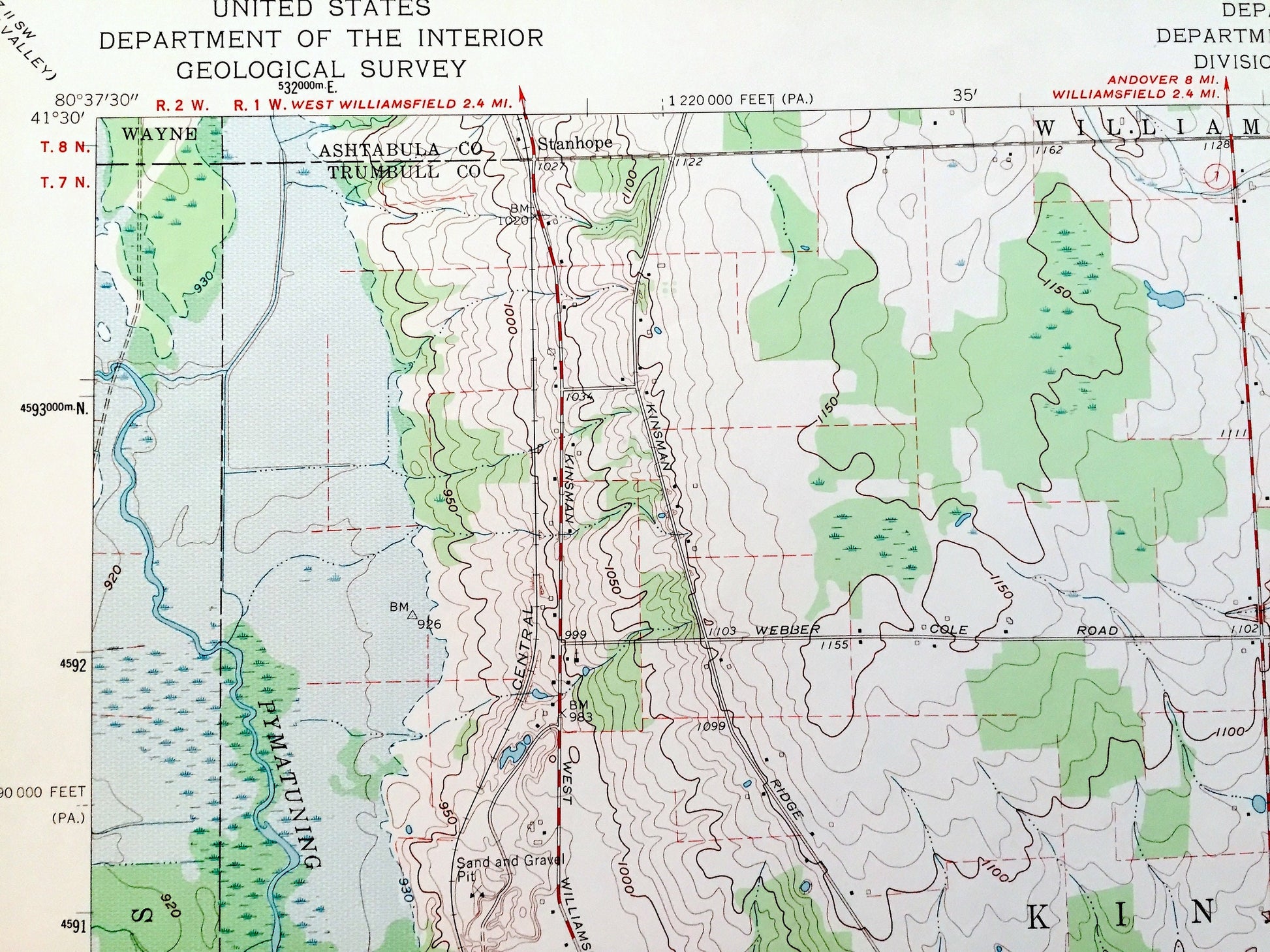 Beautiful, antique map of Kinsman, Ohio and surrounding Ashtabula County and Trumbull County areas, including Pennsylvania’s Mercer County and Crawford County. This is an authentic 1961 edition, 1970 print from the U.S. Geological Survey and NOT a computer reproduction.