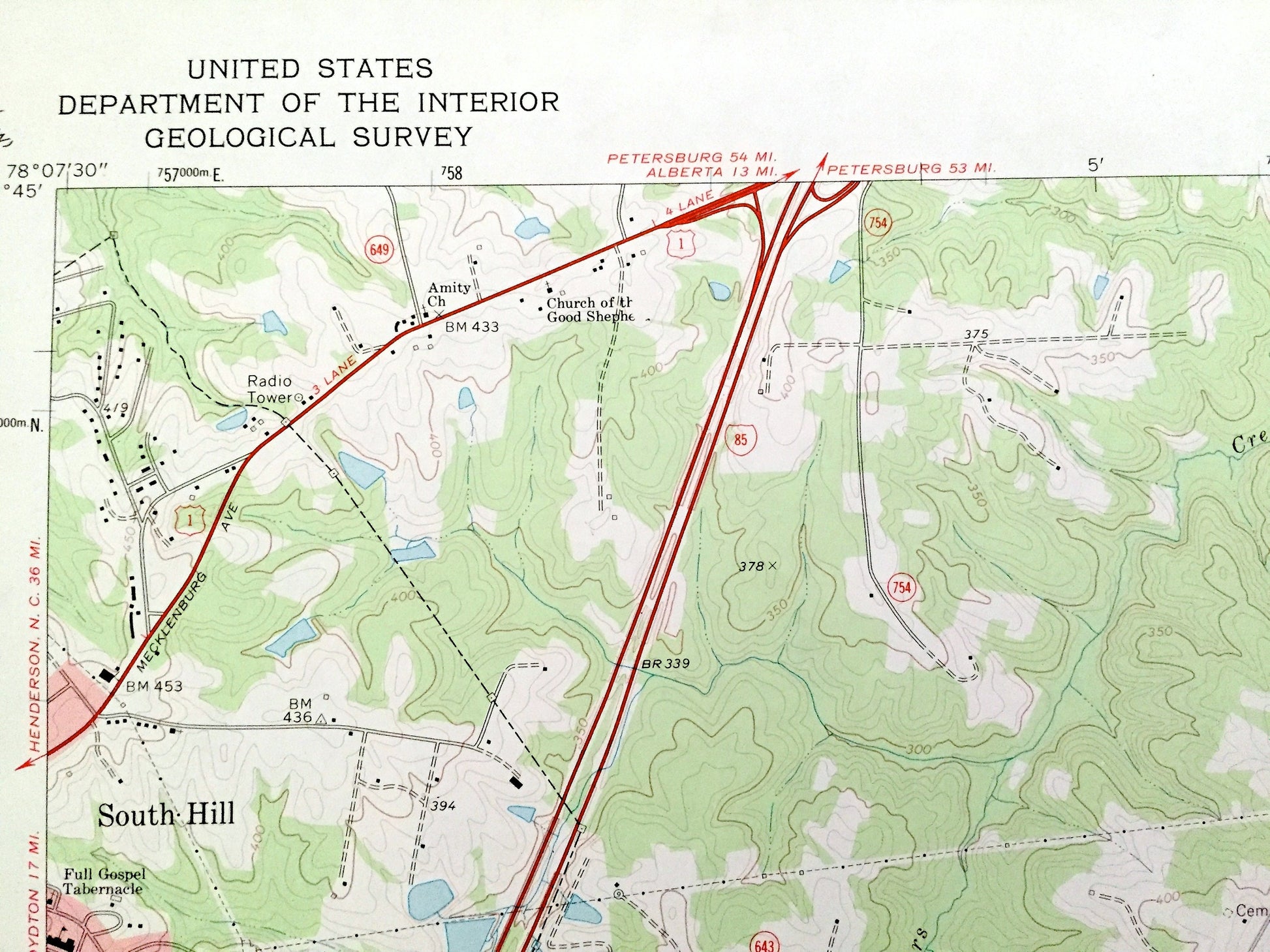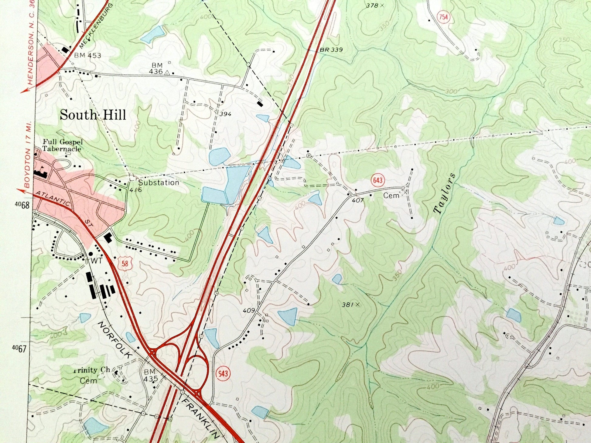 Points of Interest: Mecklenburg County, Brunswick County, Taylors Creek, Little Genito Creek, Hagood Creek, Seaboard Coast Railroad Line, Norfolk Franklin Danville Railroad Line, Evans Creek, Main Creek, Pole Creek, site of Mecklenburg-Brunswick Regl-AVC Airport, and many more hills, creeks, ponds, houses, schools, churches and roads.