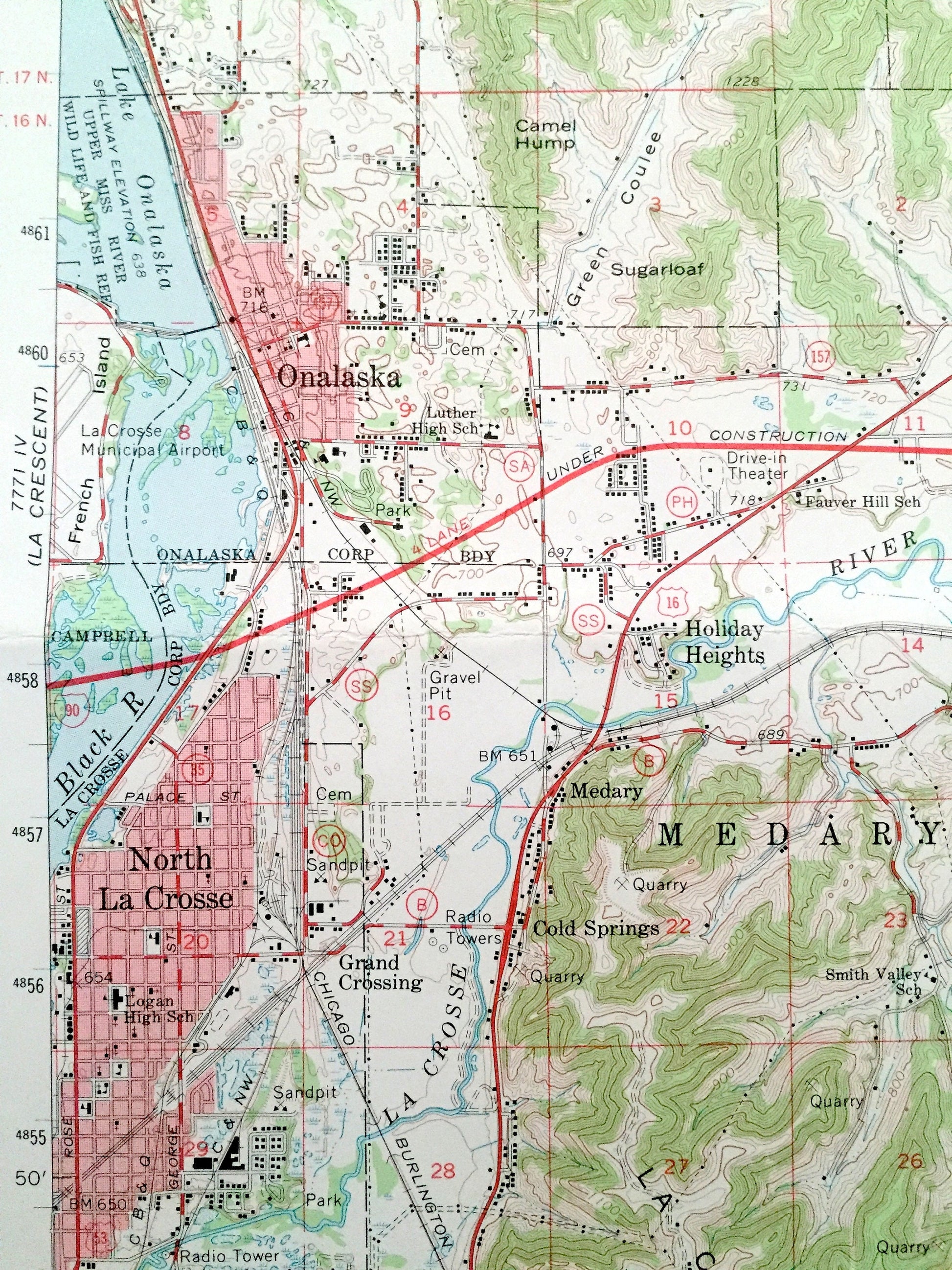 Beautiful, antique map of La Crosse, Wisconsin and surrounding La Crosse County areas, including Minnesota’s Houston County. This is an authentic 1963 edition, 1967 print from the U.S. Geological Survey and NOT a computer reproduction.