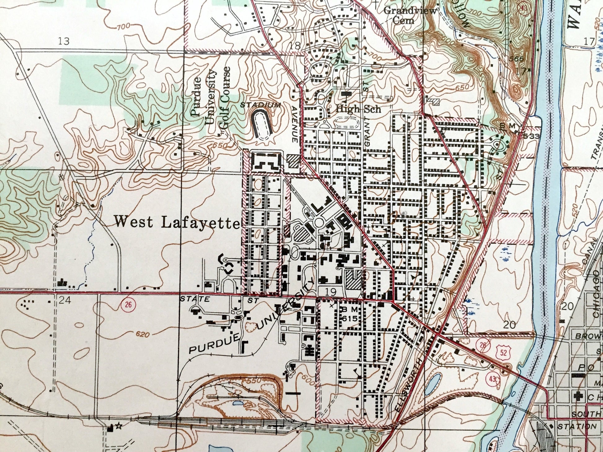 Points of Interest: Tippecanoe County, Wabash River, Purdue Airport, future site of Purdue University, Holley Lake, Big Wea Creek, Indiana State Soldiers Home, Fairgrounds, and lots more creeks, lakes, hills, houses, schools, churches, train tracks and roads.