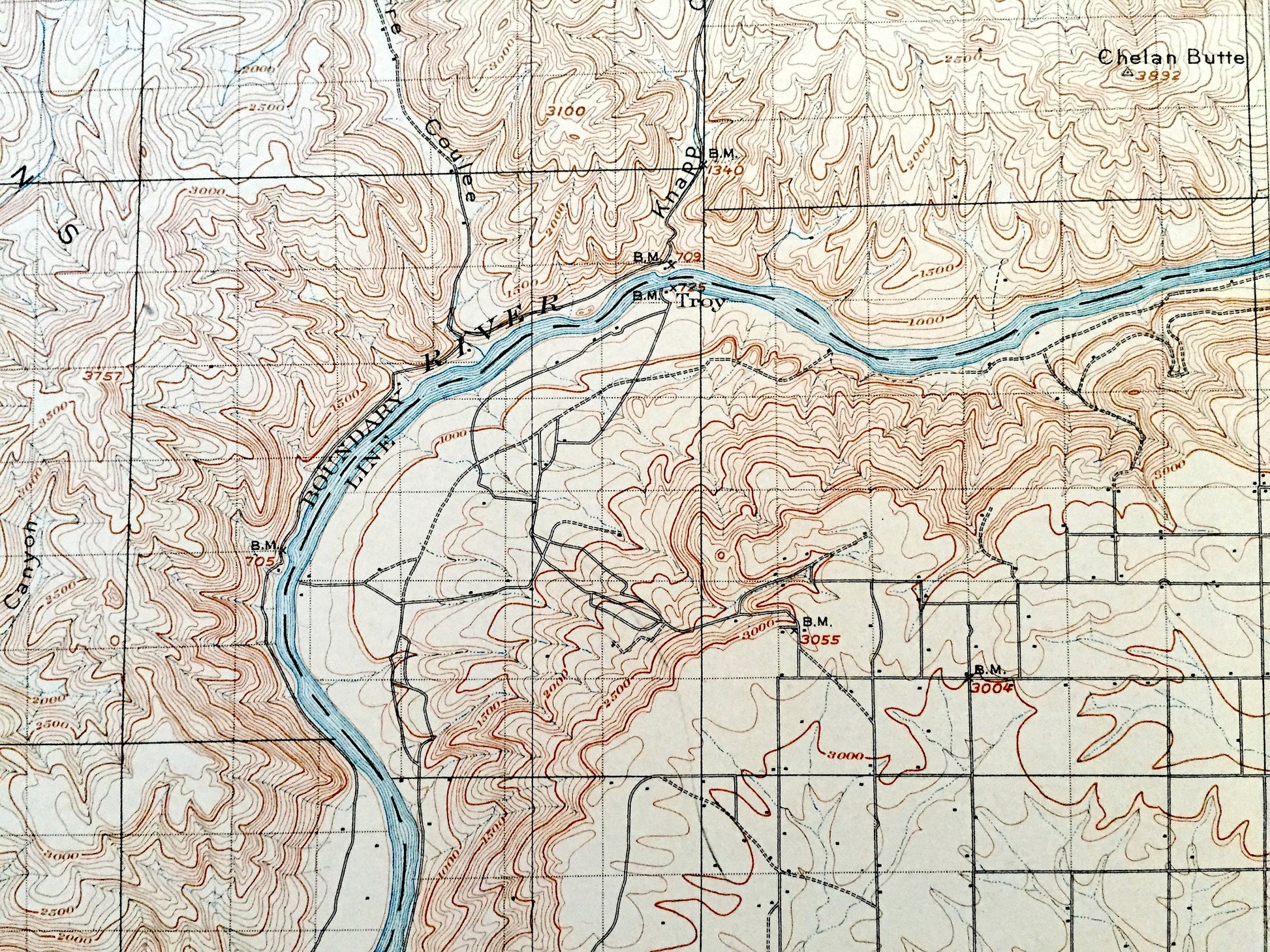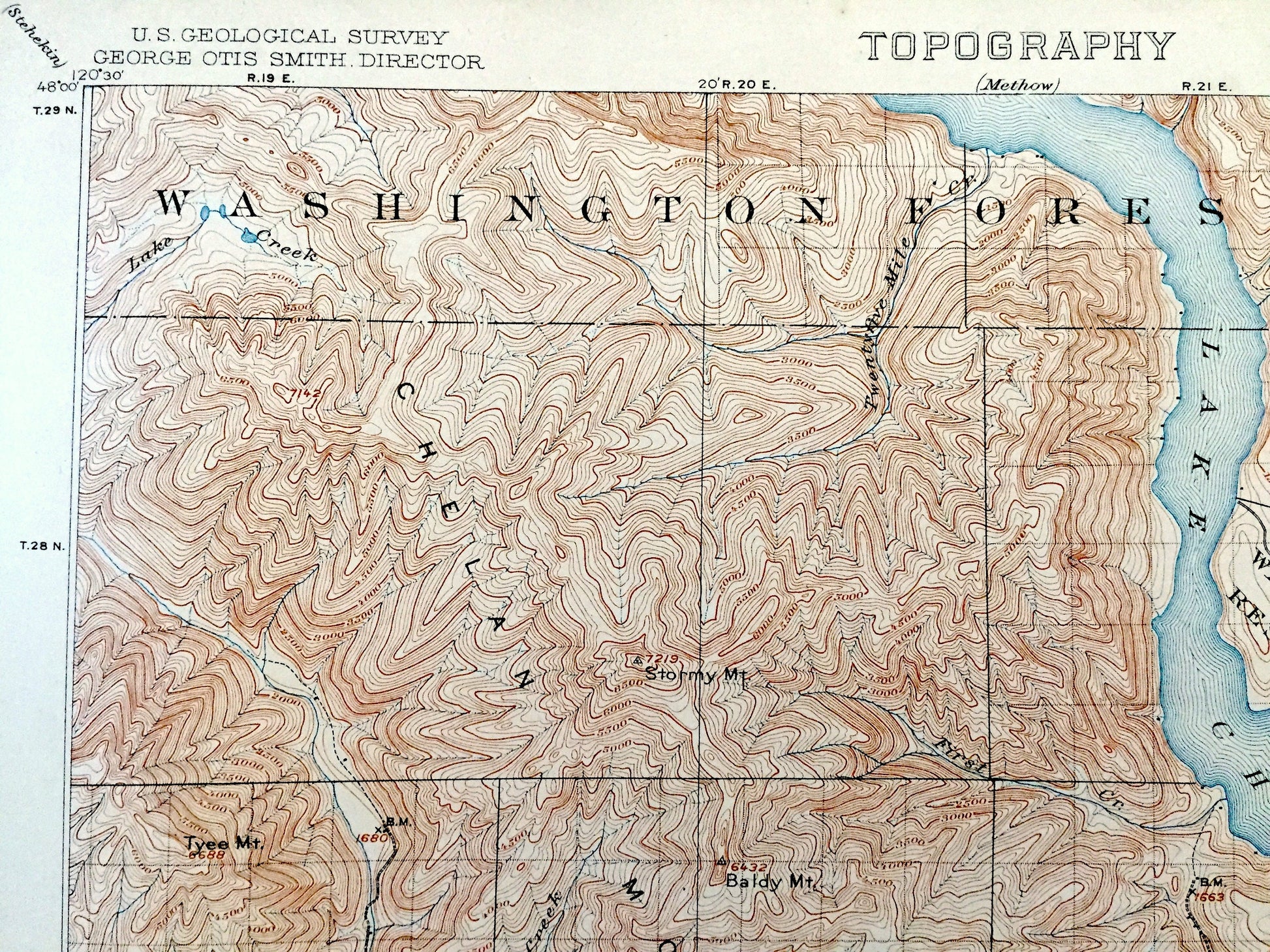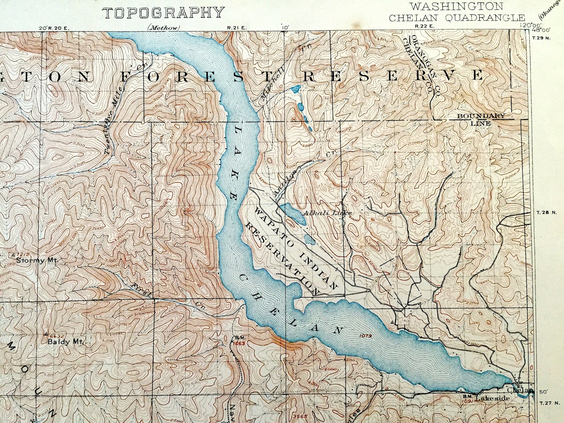 Points of Interest: Chelan County, Douglas County, Okanogan County, Lake Chelan, Wapato Indian Reservation, Washington Forest Reserve, Columbia River, Alkali Lake, Chelan Range, Chelan Butte, Stormy Mountain, Tyee Mountain, Mad Creek, Badger Mountain, Wenache River, Navarre Coulee, Knapp Coulee, and lots more hills, mountains, creeks, towns, roads and train tracks.