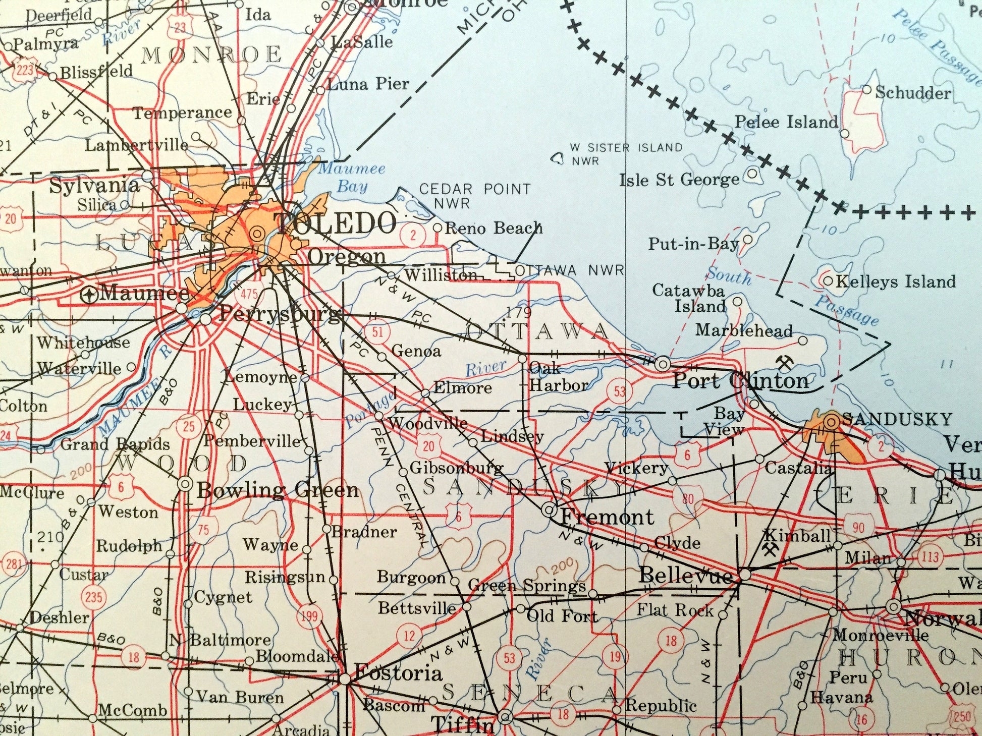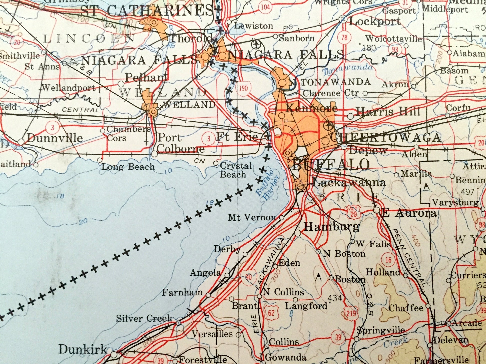 Points of Interest: Lake Erie, Lake Ontario, Lake Huron, Lake St. Clair, Saginaw Bay, Long Point Bay, Ohio River, Cass River, St. Clair River, Allegheny River, Thames River, Michigan, Ohio, Pennsylvania, New York, Ontario and lots more hills, mountains, lakes, rivers, creeks, roads, highways and railroads.