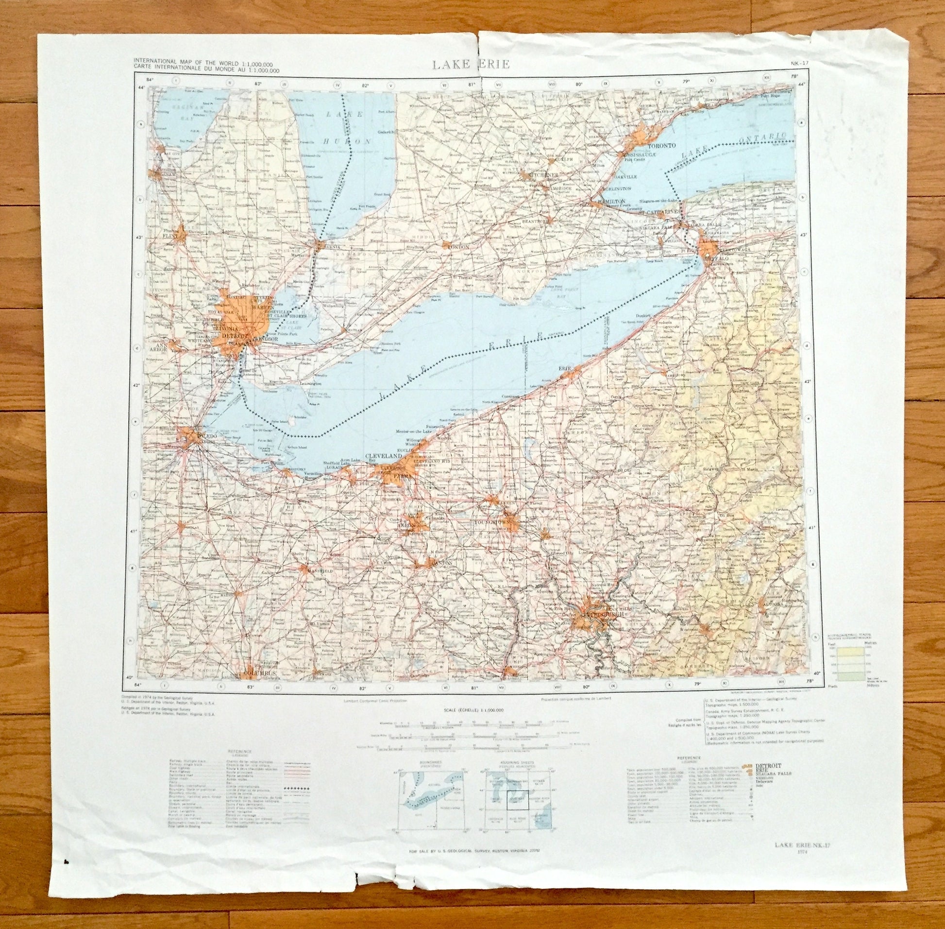 Antique Lake Erie 1974 US Geological Survey Topographic Map – Detroit, Ann Harbor, Cleveland, Pittsburgh, Buffalo, Niagara Falls, Toronto