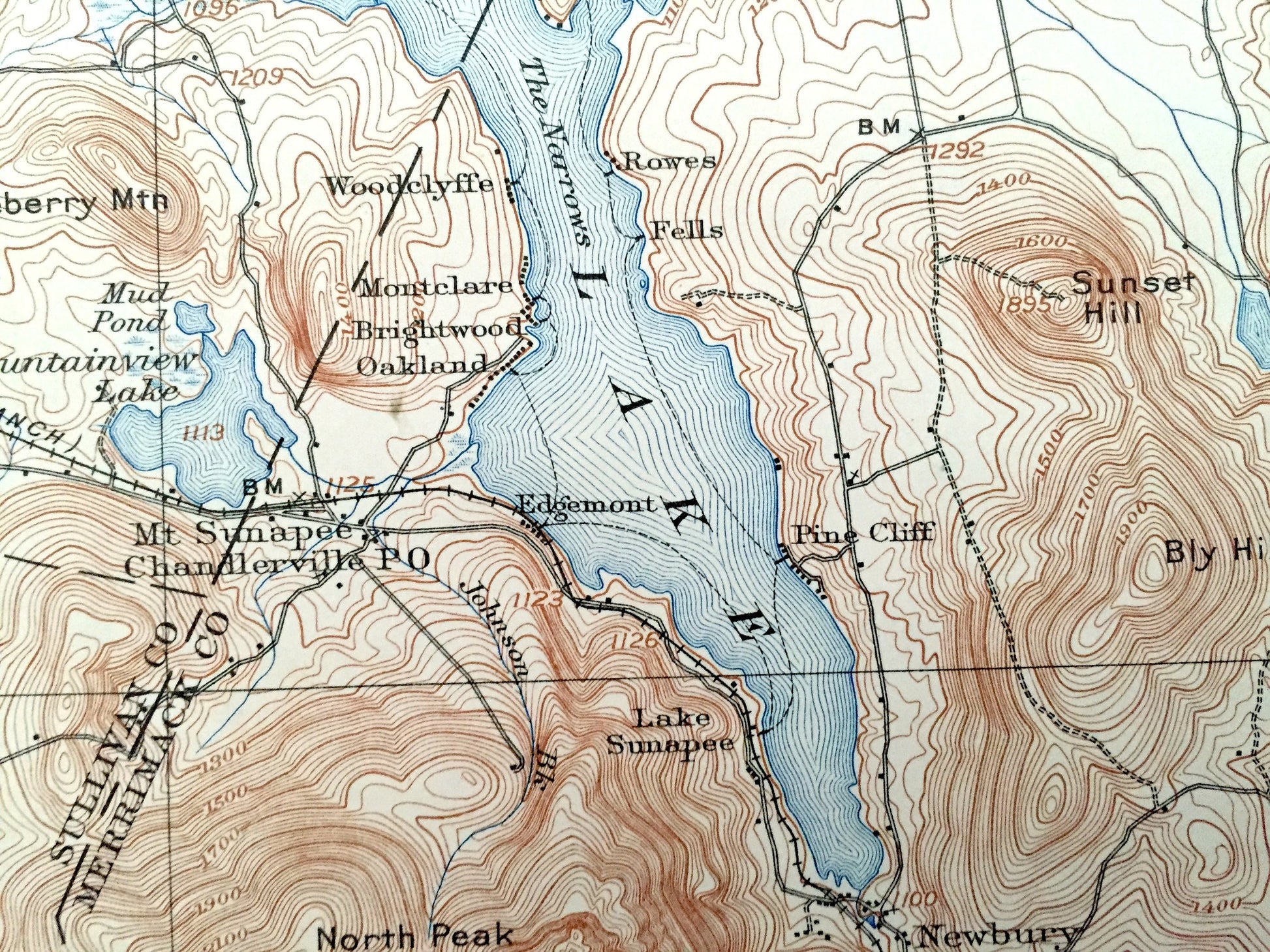 Points of Interest: Lake Sunapee, Little Sunapee Lake, Otter Pond, Mountainview Lake, Baptist Pond, Long Pond, Perkins Pond, Messer Pond, Kolelemook Lake, Stocker Pond, Sanborn Pond, Rockybond Pond, Spectacle Pond, Sucker Pond, Crescent Lake, Gilman Pond, Rand Pond, Sugar River, Croydon Mountain, Sunapee Mountain, Pillsbury State Forest Reservation, Croydon Peak, Sanborn Hill, Baltimore Hill, cakes Hump, Browns Hill, Coit Mountain, Bald Mountain, The Pinnacle, Blueberry Mountain, Sunset Hill, Bly Hill, Wilcox Hill, Pikes Hill, Mt. Tug, Page Hill, Potato Hill, Blaisdell Hill, Bald Sunapee, Bear Hill, South Peak, The Narrows, Melrose Island, Fishers Bay, Sunapee Harbor, Gardiner Bay, Herrick Cove, Boston & Maine Railroad (Claremont Branch) and lots more hills, mountains, streams, ponds, marshes, camps, houses, islands, coves, roads, railroads.
