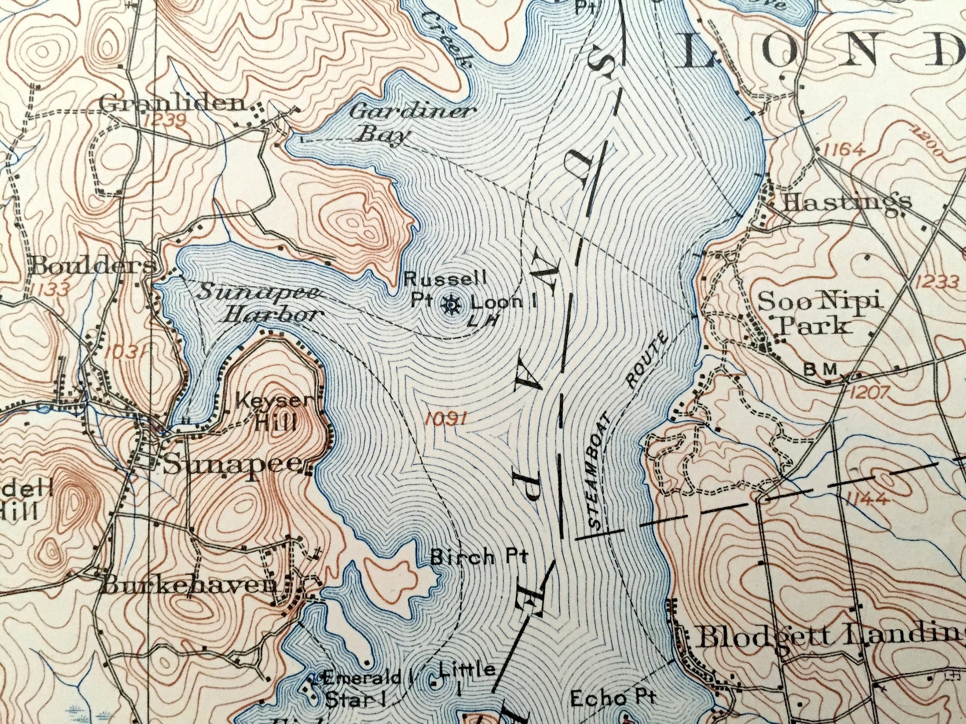 Beautiful, antique map of Lake Sunapee, New Hampshire (here written as Sunapee Lake), including surrounding Sullivan County & Merrimack County area. This is an authentic 1905 edition, 1947 print from the U.S. Geological Survey and NOT a computer reproduction.