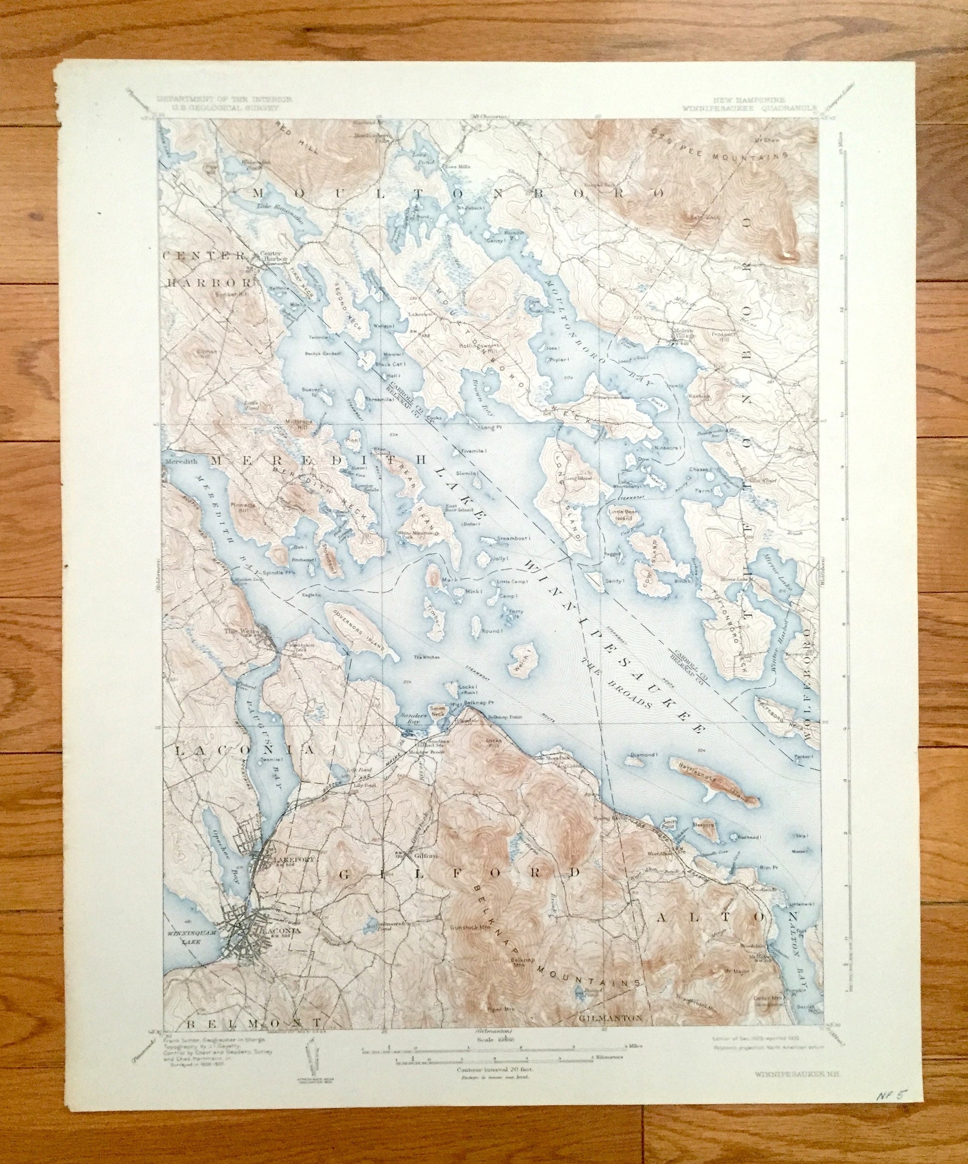 Beautiful, antique map of Lake Winnipesaukee, New Hampshire and surrounding area. This is an authentic 1909 edition, 1935 print from the U.S. Geological Survey and NOT a computer reproduction.