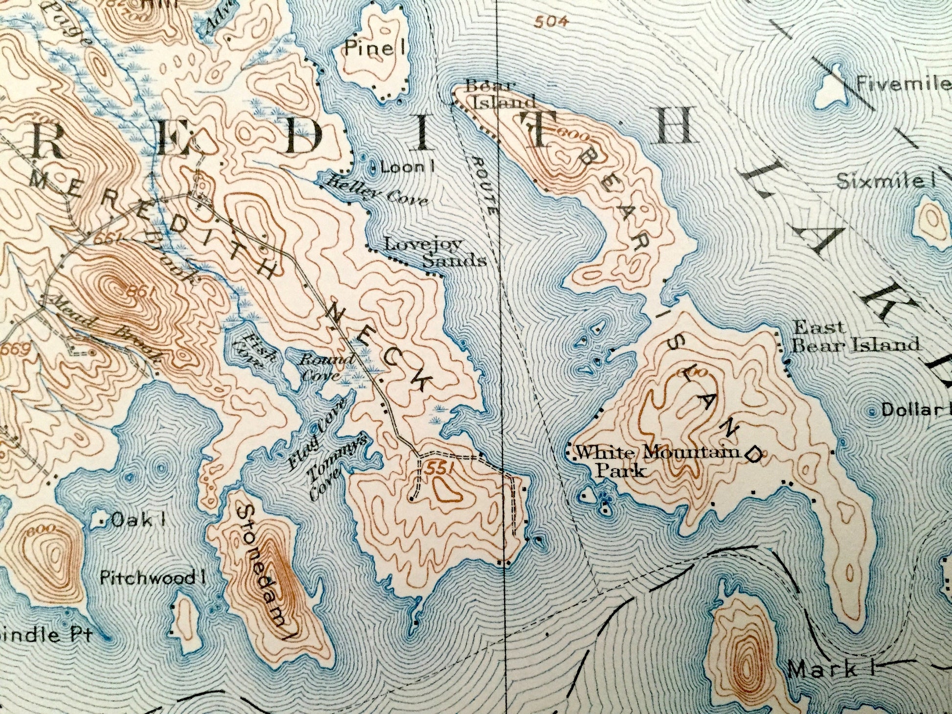 Points of Interest: Belknap County, Carroll County, Lake Winnipesaukee, Squam Lake, Winnisquam Lake, Mirror Lake, Lake Kanasatka, Wakondah Pond, Lees Pond, Lily Pond, Round Pond, Opechee Bay, Paugus Bay, Sanders Bay, The Broads, Meredith Bay, Moultonboro Bay, Winter Harbor, Alton Bay, Governors Island, Bear Island, Rattlesnake Island, Long Island, Cow Island, Stonedam Island, Timber Island, Mark Island, Mink Island, Steamboat Island, Jolly Island, Camp Island, Lockes Island, Welch Island, Belknap Mountains, Red Hill, Ossipee Mountains, Gunstock Mountain, Piper Mountain, Mt. Major, Lockes Hill, Straightback Mountain, Cedar Mountain, Bald Knob, Mt. Shaw, Pine Hill, Sunset Hill, Gilman Hill, Millstone Hill, Meredith Neck, Moultonboro Neck, Tuftonboro Neck, Smith Neck (Varney Point), Smith Cove, Maiden Lady Cove, Pumpkin Point, Woodmans Cove, Gunstock River, Minge Brook, Jewett Brook, Shannon Brook, Pickerel Cove, Boston & Maine Railroad and lots more hills, mountains, streams, ponds, marshes, camps, roads, coves and islands.