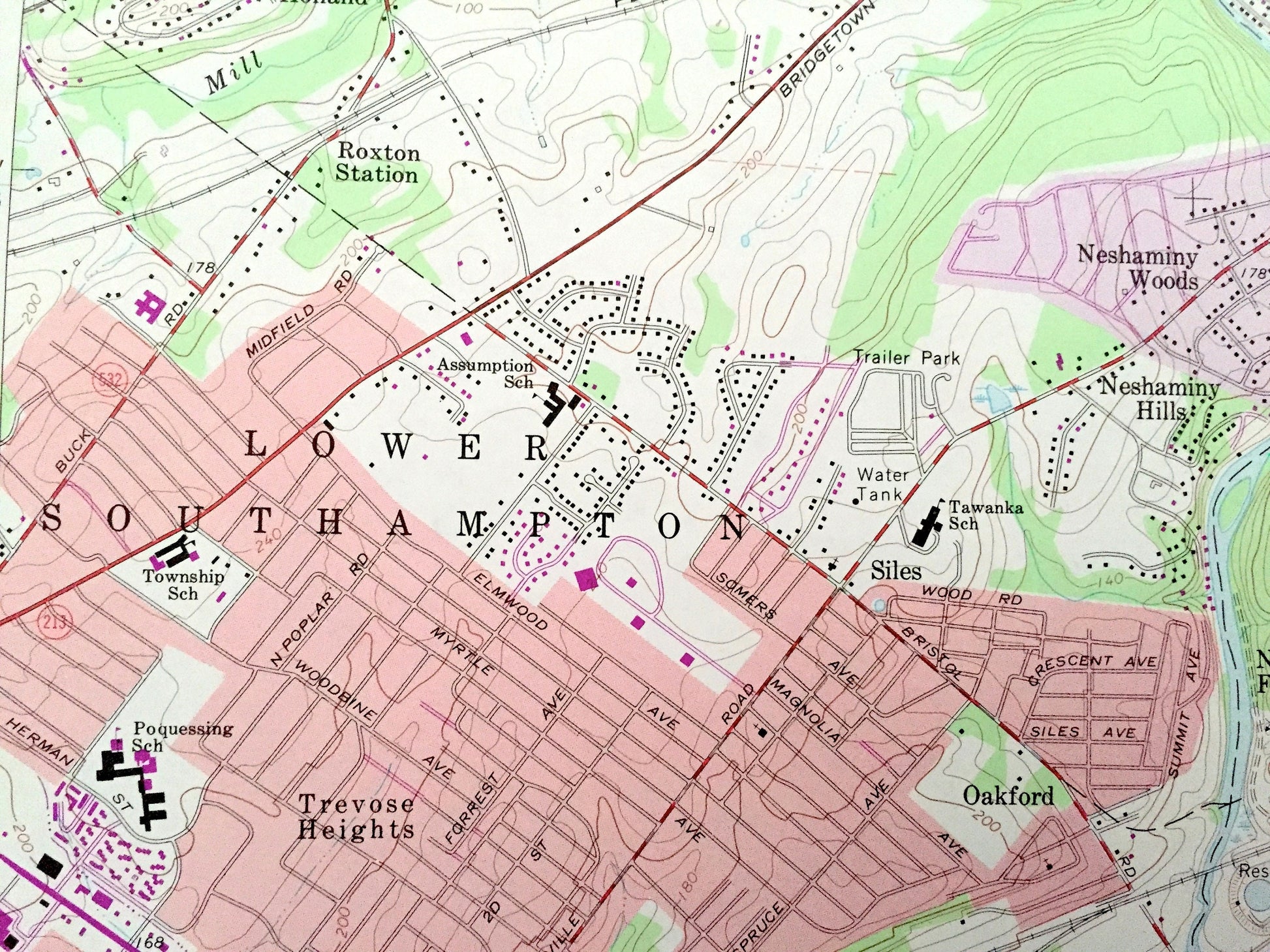 Points of Interest: Eastern State School and Hospital, Reading Railroad, Pennsylvania Turnpike, Mill Creek Valley Park, Middletown Meetinghouse, Playwicki Park, Northampton Country Club, Springfield Lake, Neshaminy Creek, Mill Creek, Core Creek, Pine Run, and many more hills, streams, ponds, houses, schools, railroads, churches and roads.