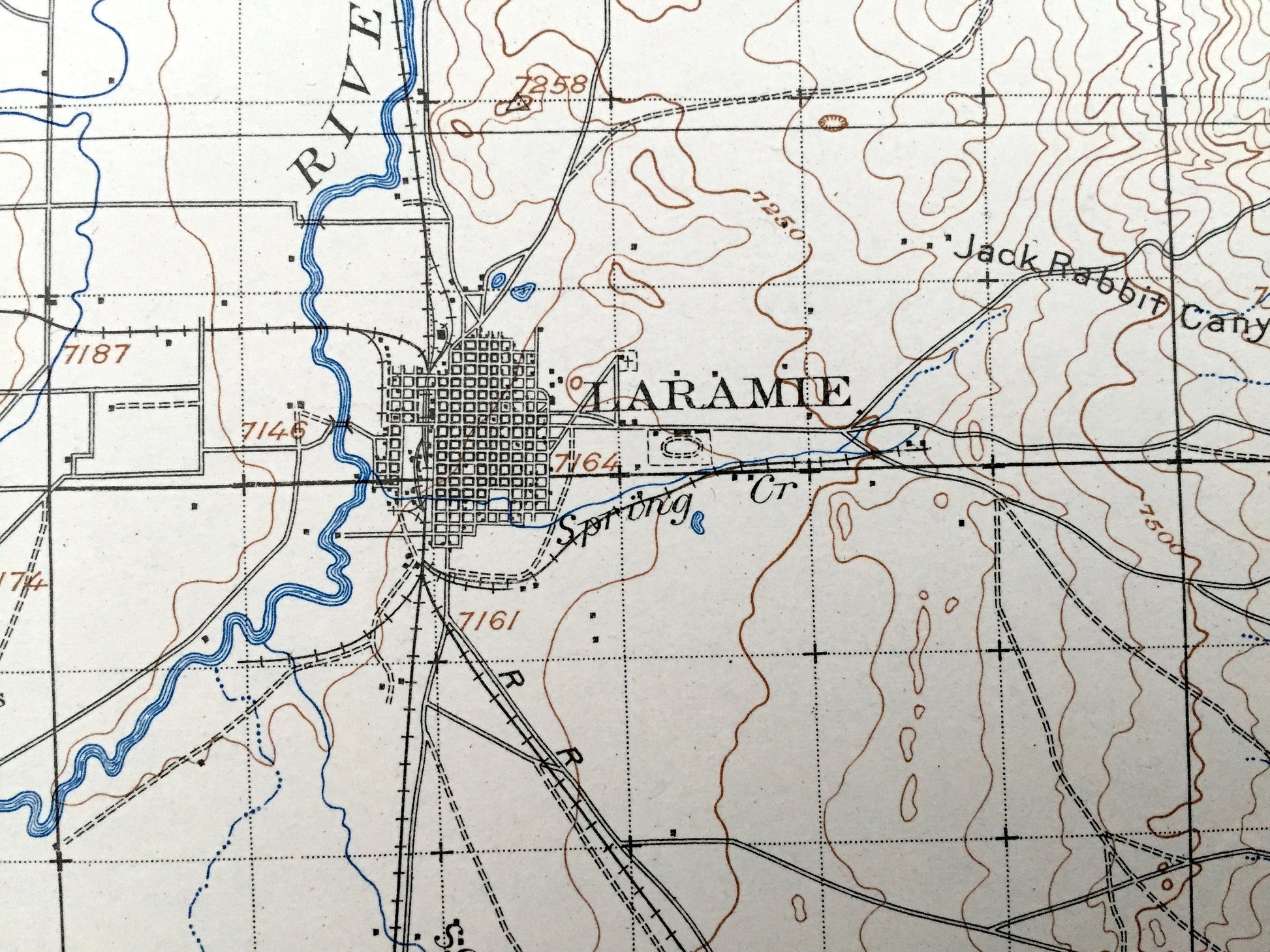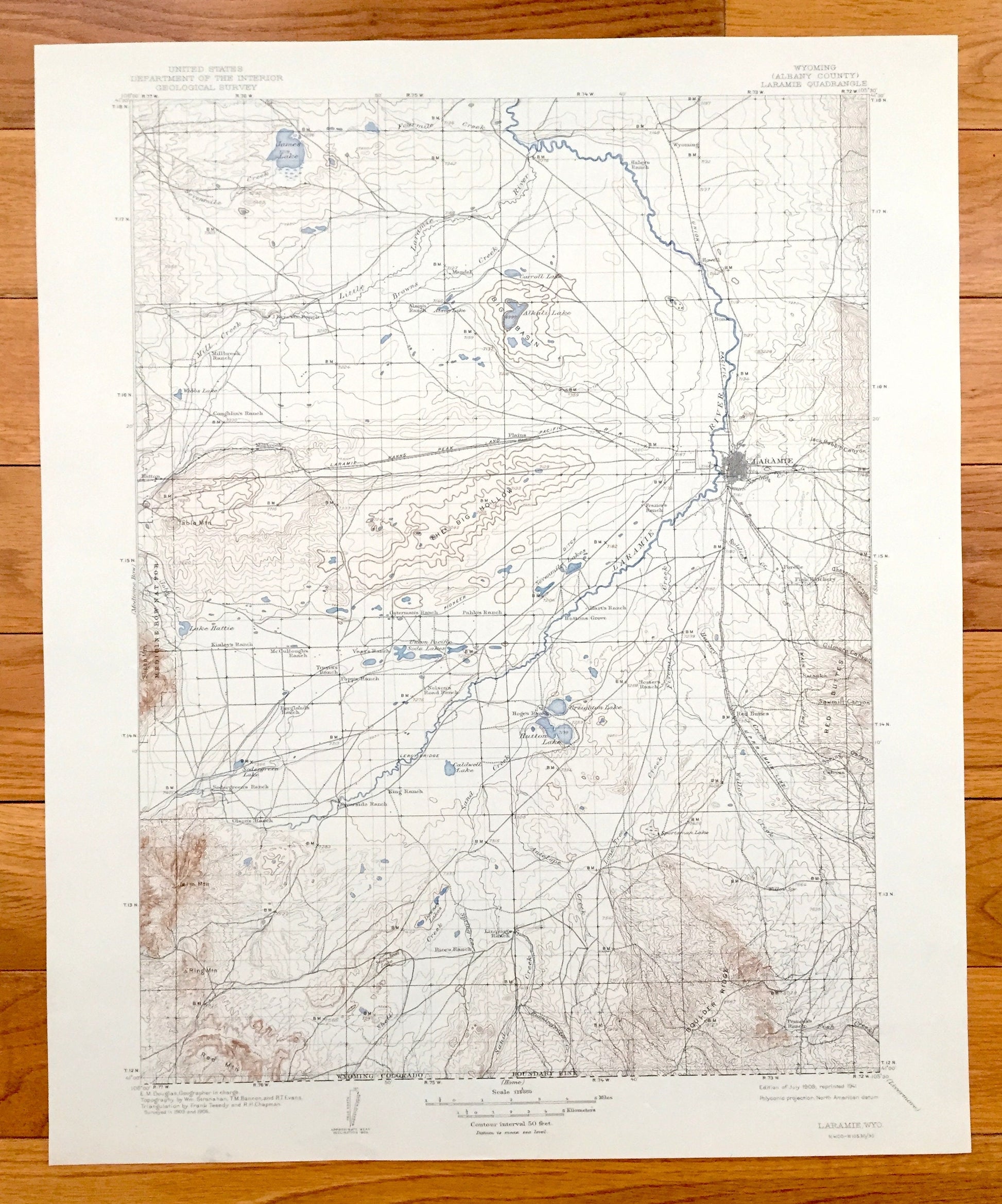 Beautiful, antique map of Laramie, Wyoming and surrounding Albany County area. This is an authentic 1908 edition, 1941 print from the U.S. Geological Survey and NOT a computer reproduction.