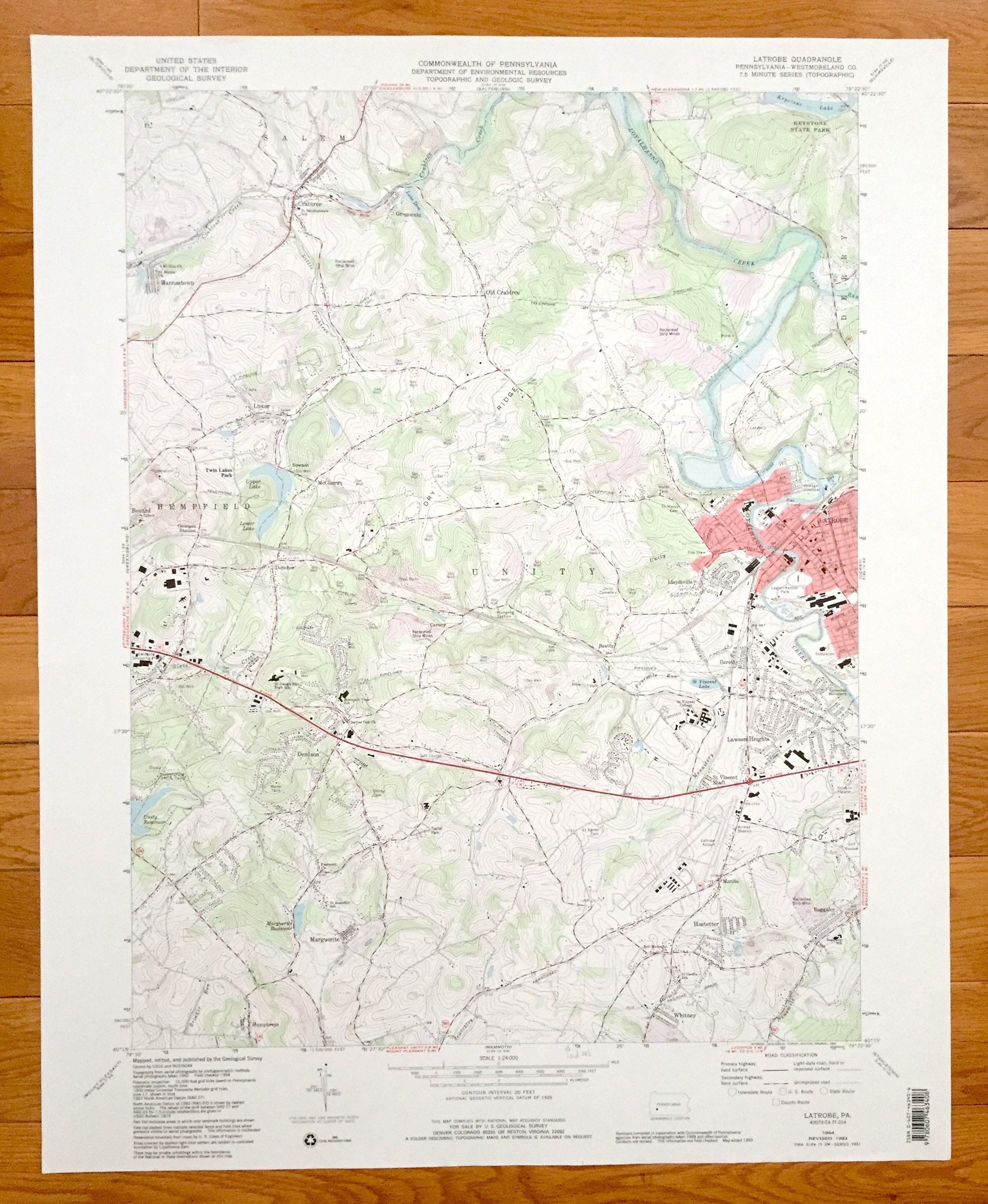 Points of Interest: Loyalhanna Creek, Keystone State Park, Keystone Lake, Crabtree Creek, Lake Dom, Dry Ridge, Upper Lake, Lower Lake, St. Vincent College, St. Vincent Lake, Carmelite Monastery, Greensburg YMCA Camp, Unity Reservoir, Abandoned Railroad, Marguerite Reservoir, Drive-in Theater, Latrobe Airport, and many more hills, streams, ponds, houses, schools, churches and roads.