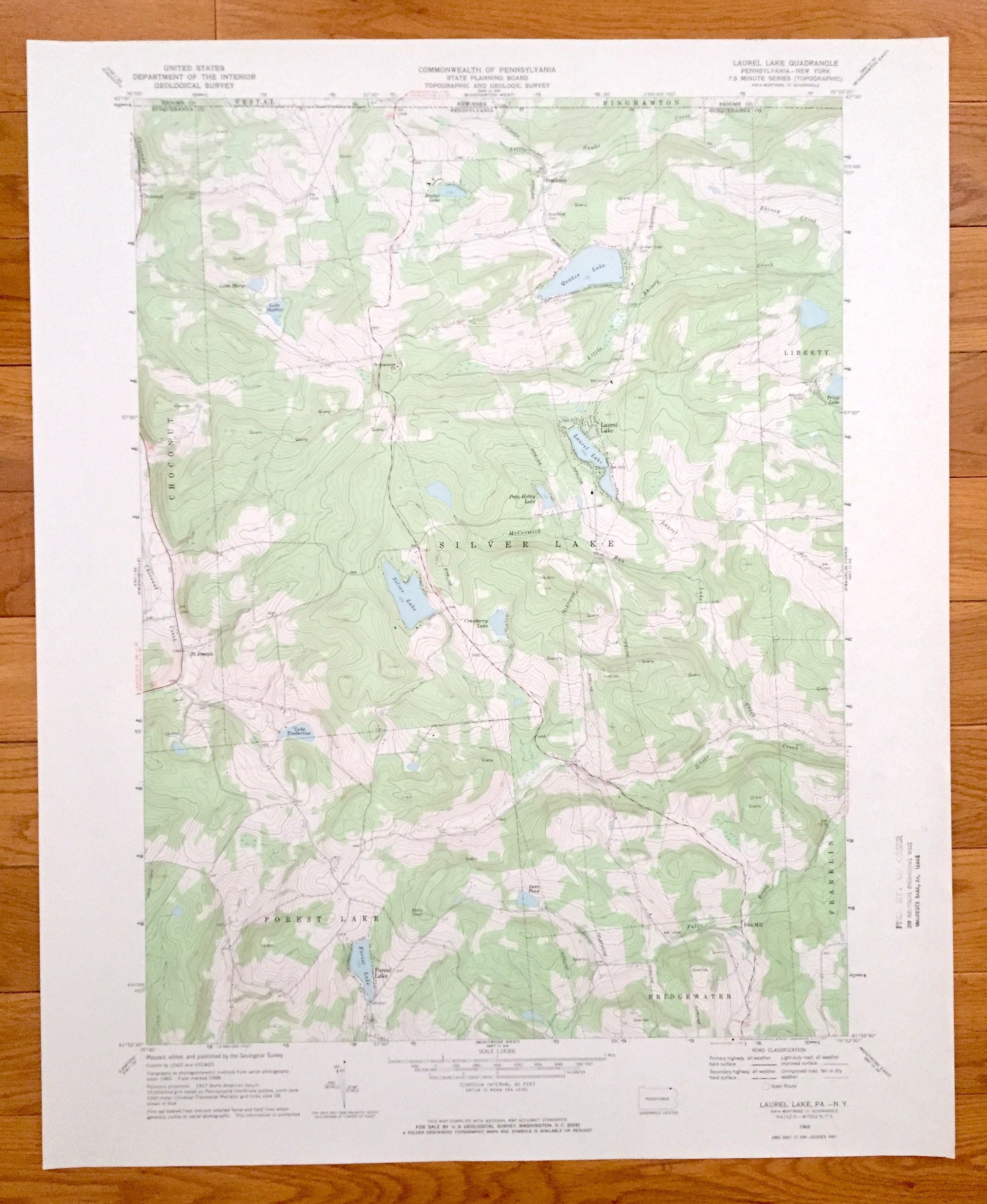 Beautiful, antique map of Laurel Lake, Pennsylvania and surrounding Susquehanna County and Broome County, New York area. This is an authentic 1968 edition, 1968 print from the U.S. Geological Survey and NOT a computer reproduction.