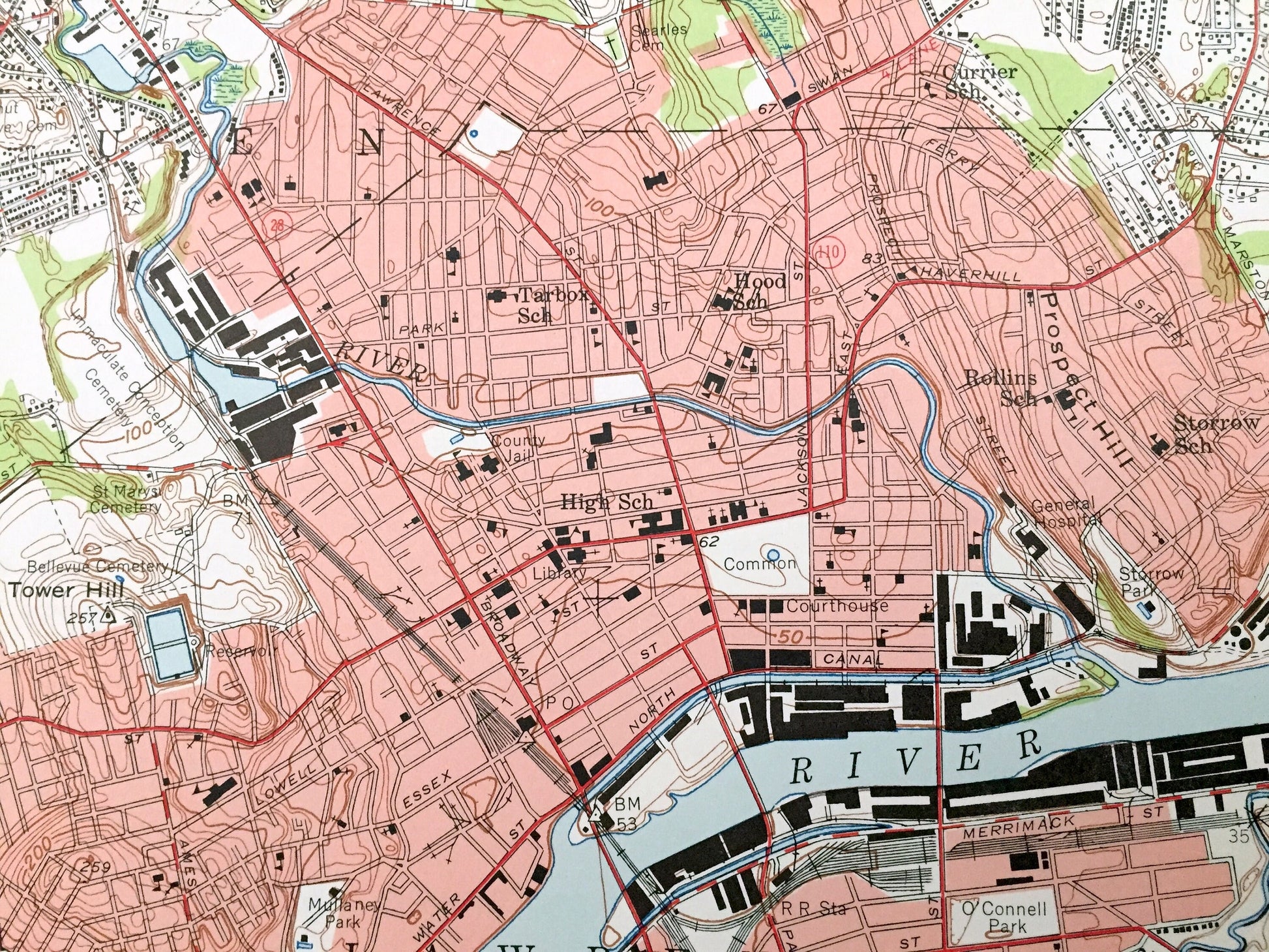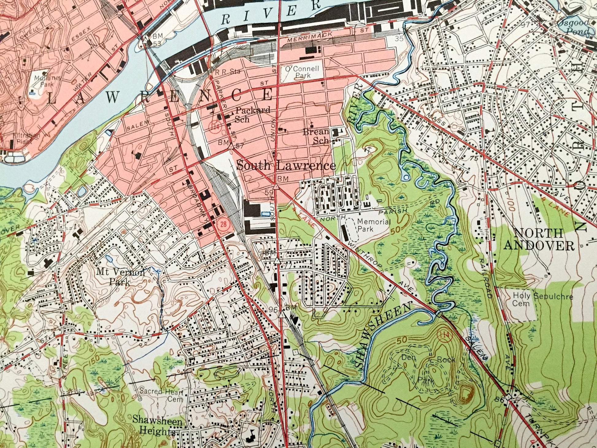 Points of Interest: Merrimack College, Abbott Academy, Burke Memorial Hospital, Lawrence Municipal Airport, Meetinghouse Hill, Tower Hill, Daddy Frye Hill, Wood Hill, Ames Hill, Nickel Mine Hill, Forest Lake, Mystic Pond, Haggetts Pond, Ames Pond, Merrimack River, Shawsheen River, Spickett River, Bare Meadow Brook, Harris Brook, Fish Brook, and many more hills, streams, ponds, houses, schools, railroads, churches and roads.