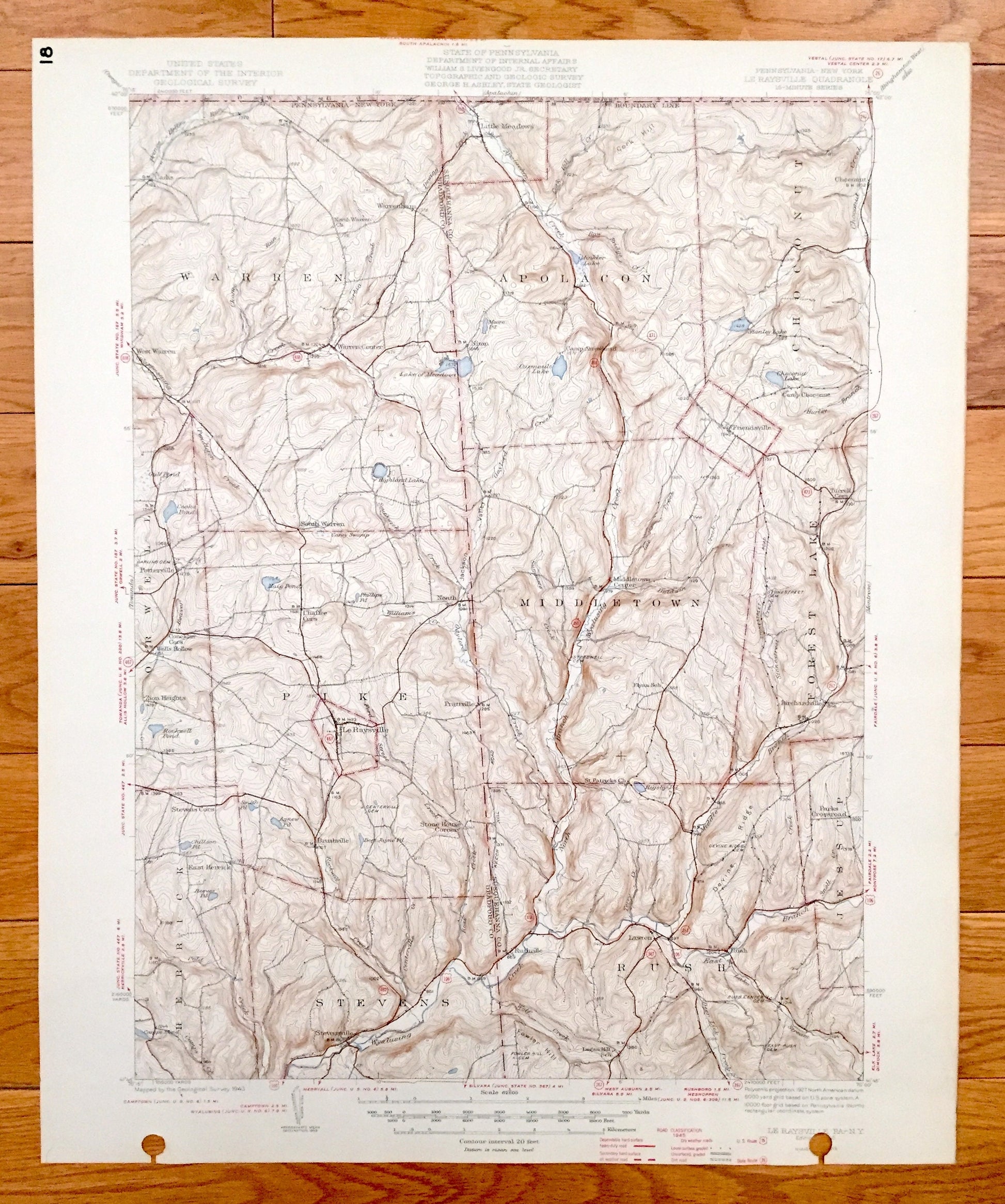 Beautiful, antique map of Le Raysville, Pennsylvania and surrounding Bradford County, Susquehanna County and New York areas. This is an authentic 1943 print from the U.S. Geological Survey and NOT a computer reproduction.