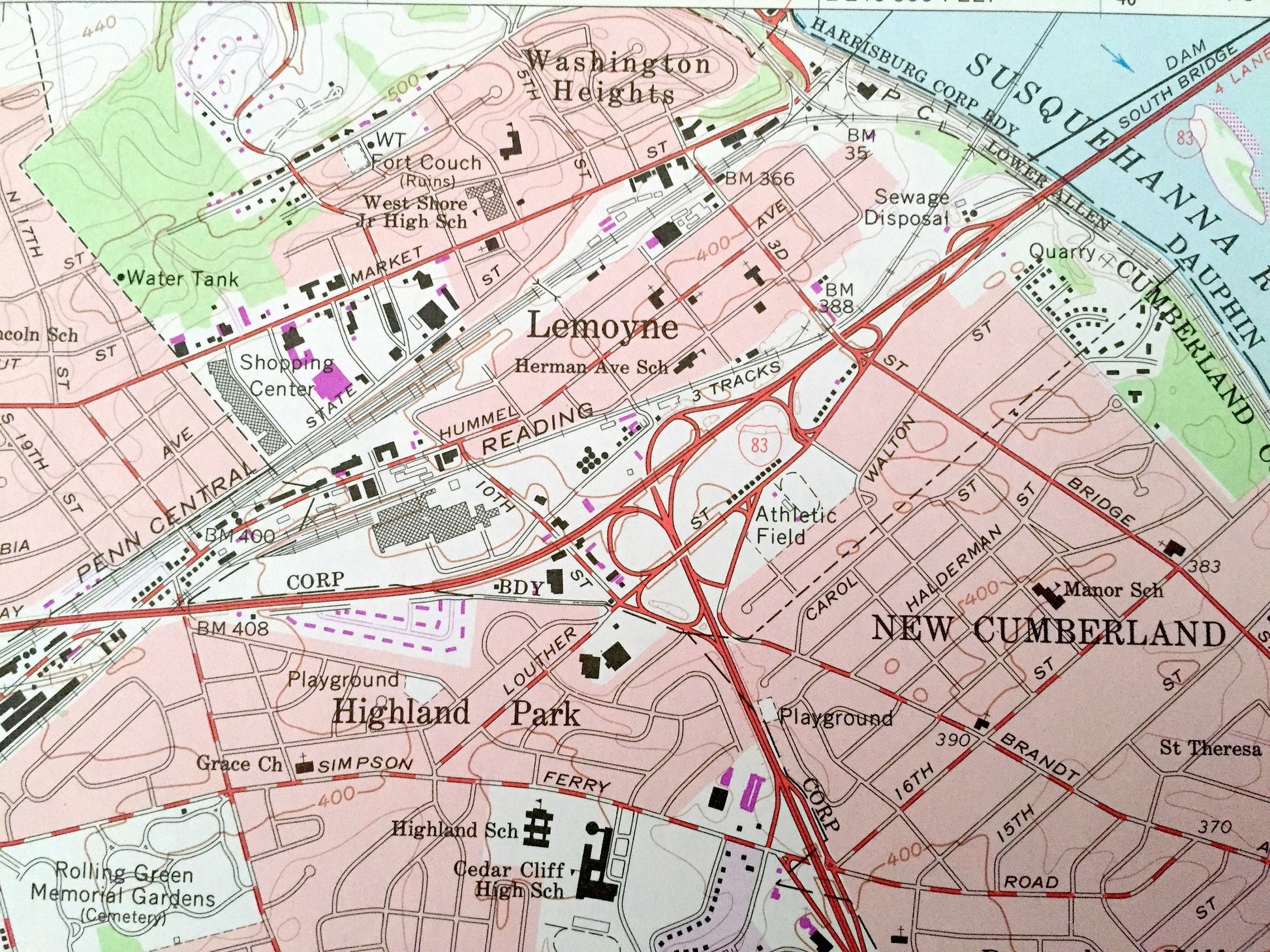 Beautiful, antique map of Lemoyne, Pennsylvania and surrounding Cumberland & York County area. This is an authentic 1963 edition, 1972 print from the U.S. Geological Survey and NOT a computer reproduction.