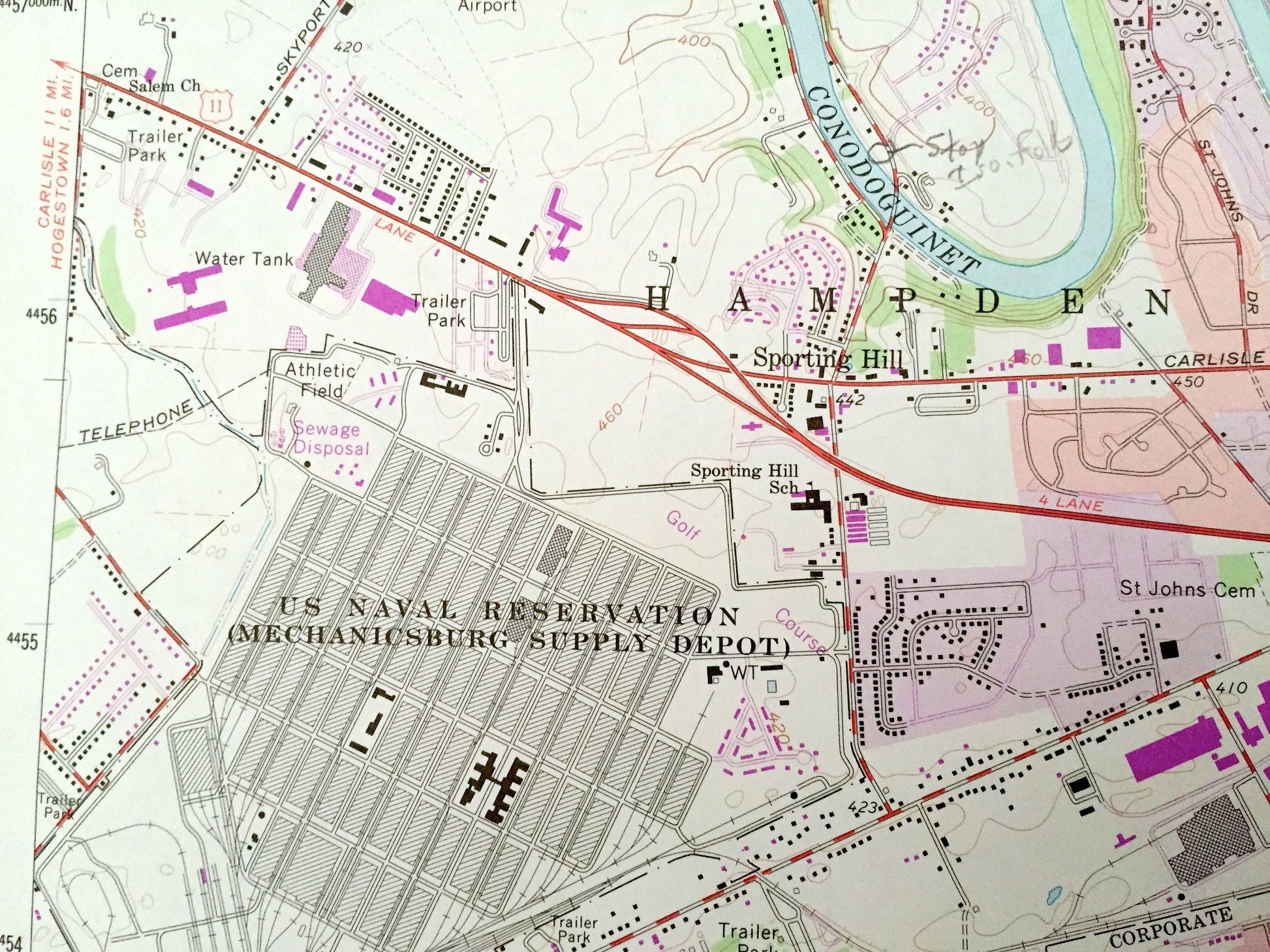 Points of Interest: Yellow Breeches Creek, Conodoguinet Creek, US Naval Reservation (Mechanicsburg Supply Depot), Mt. View Airport, Reading Railroad, Stony Run, Radio Towers, Penn Central Railroad, Dauphin County, Cumberland County, York County and many more hills, streams, ponds, houses, schools, churches and roads.