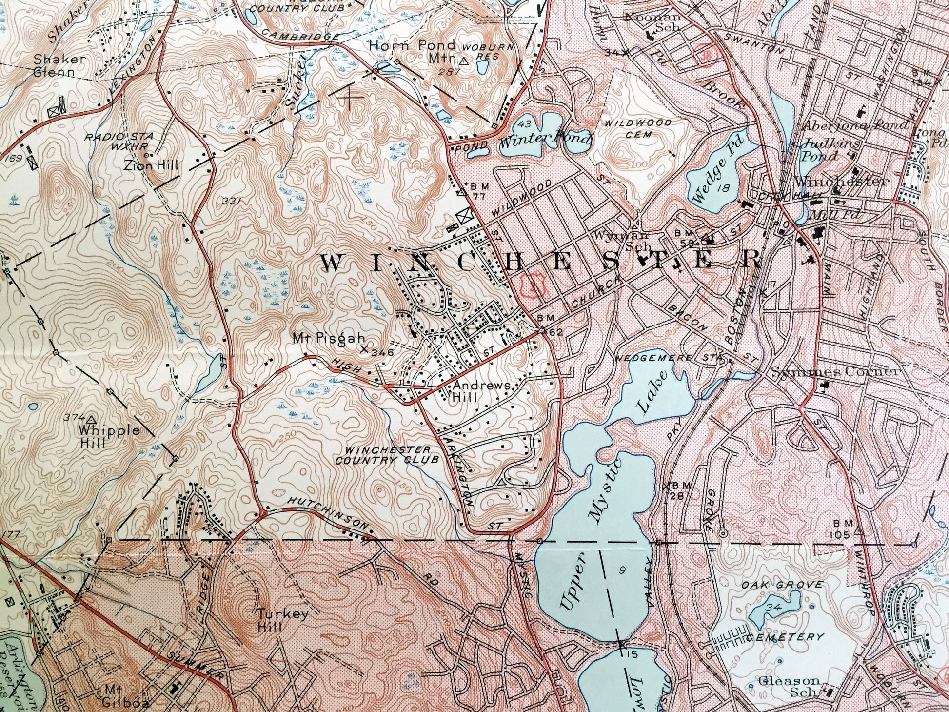 Points of Interest: Bentley College, Fernando State School, UMass College of Agriculture, McLean Hospital, Burlington Mall Shopping Center, Brannon Hill, Whispering Hill, Whipple Hill, Wellington Hill, Horn Pond, Upper Mystic Lake, Spy Pond, Fresh Pond, Hardys Pond, Aberjoua River, Mystic River, Beaver Brook, Munroe Brook, and many more hills, streams, ponds, houses, schools, railroads, churches and roads.