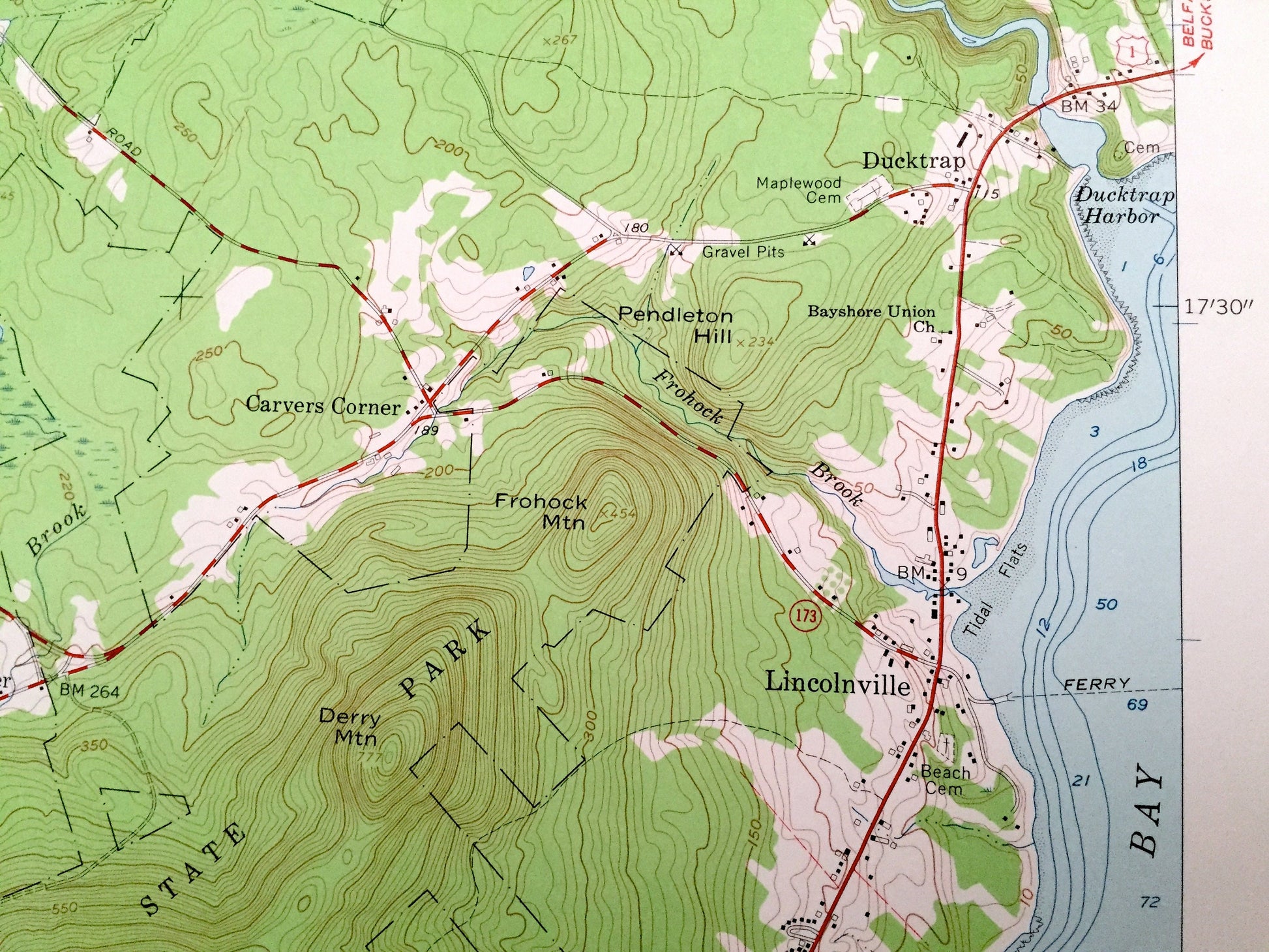 Points of Interest: Camden Hills State Park, Heals Neck, Youngs Neck, Fernalds Neck, Patterson Hill, Gould Hill, Cameron Mountain, Megunticook Mountain, Maiden Cliff, Derry Mountain, Ducktrap Mountain, Tilden Pond, Coleman Pond, Norton Pond, Megunticook Lake, West Penobscot Bay, Knight Pond, and many more hills, streams, beaches, islands, ponds, houses, schools, railroads, churches and roads.