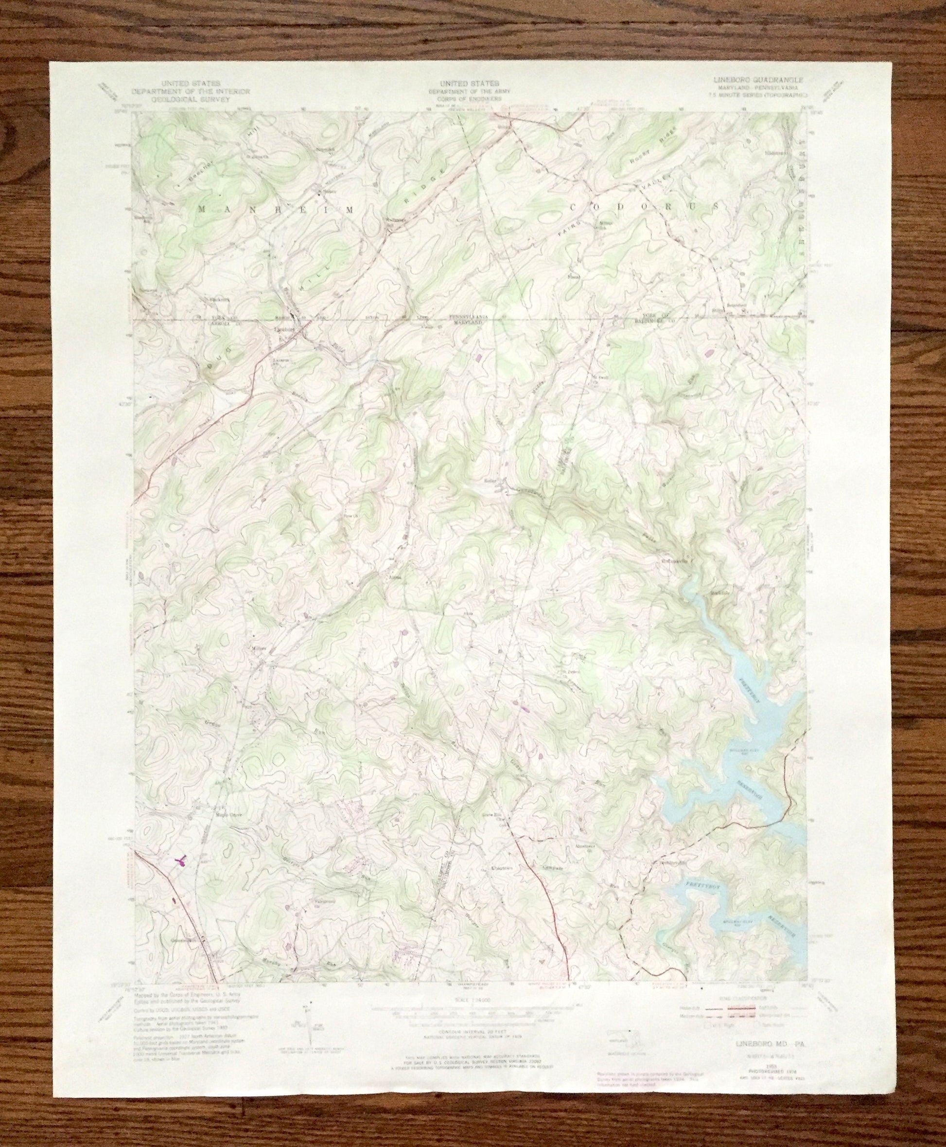 Beautiful, antique map of Lineboro, Millers, Maple Grove and Albantown, Maryland including Codorus and Manheim, Pennsylvania. This is an authentic 1953 edition, 1975 print from the U.S. Geological Survey and NOT a computer reproduction.