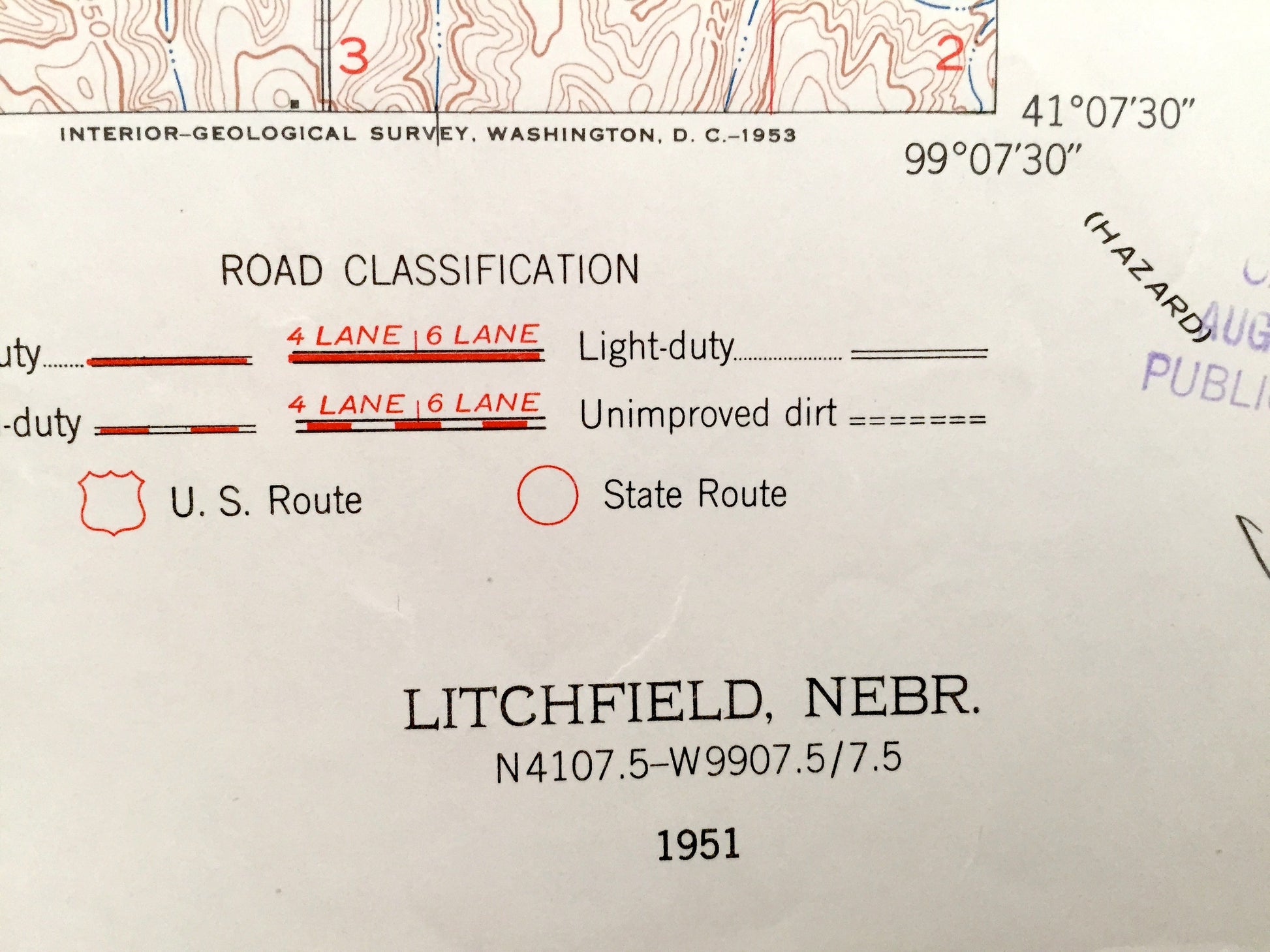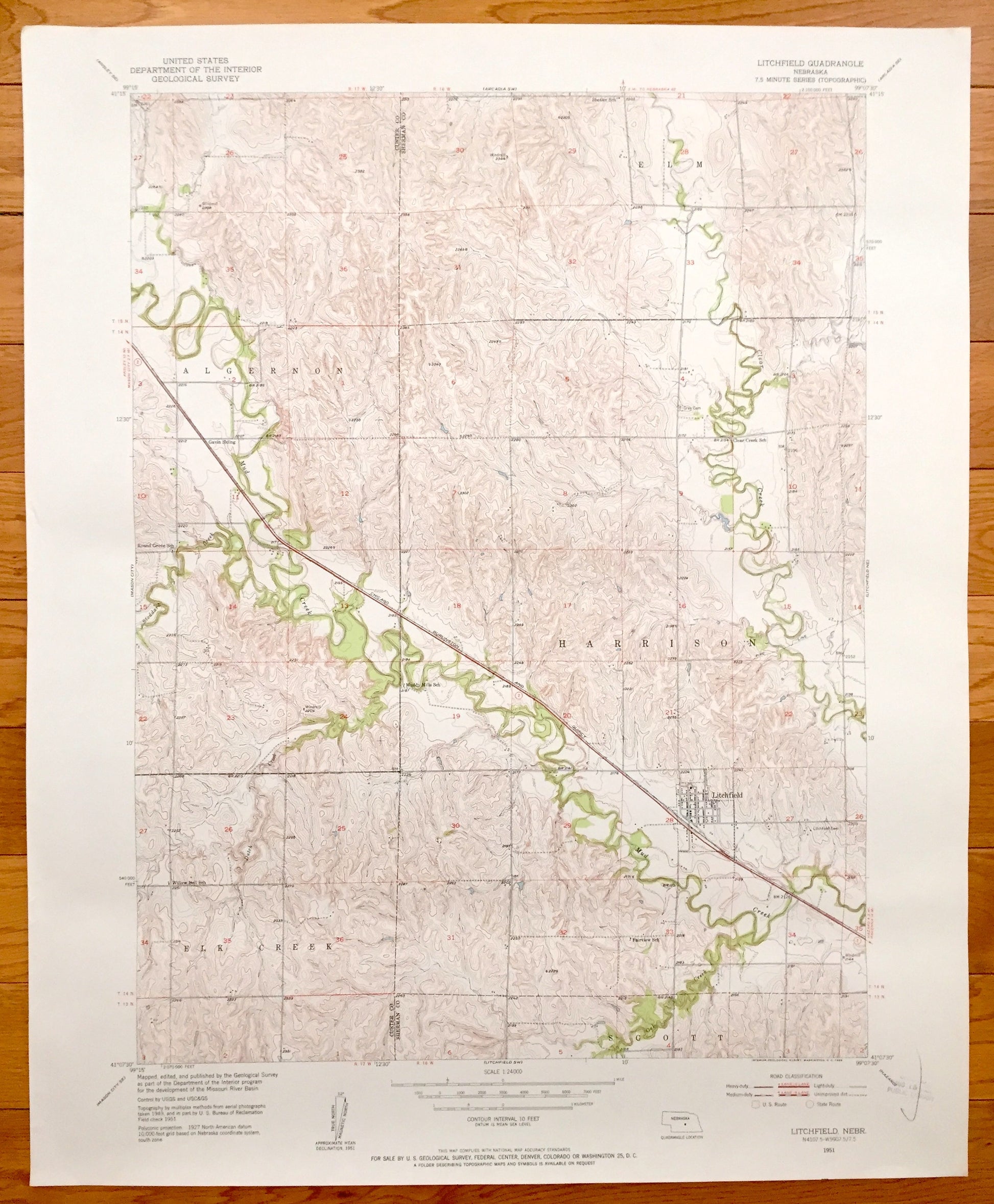 Beautiful, antique map of Litchfield, Harrison, Elm, Elk Creek, and Algernon, Nebraska. This is an authentic 1951 print from the U.S. Geological Survey and NOT a computer reproduction.