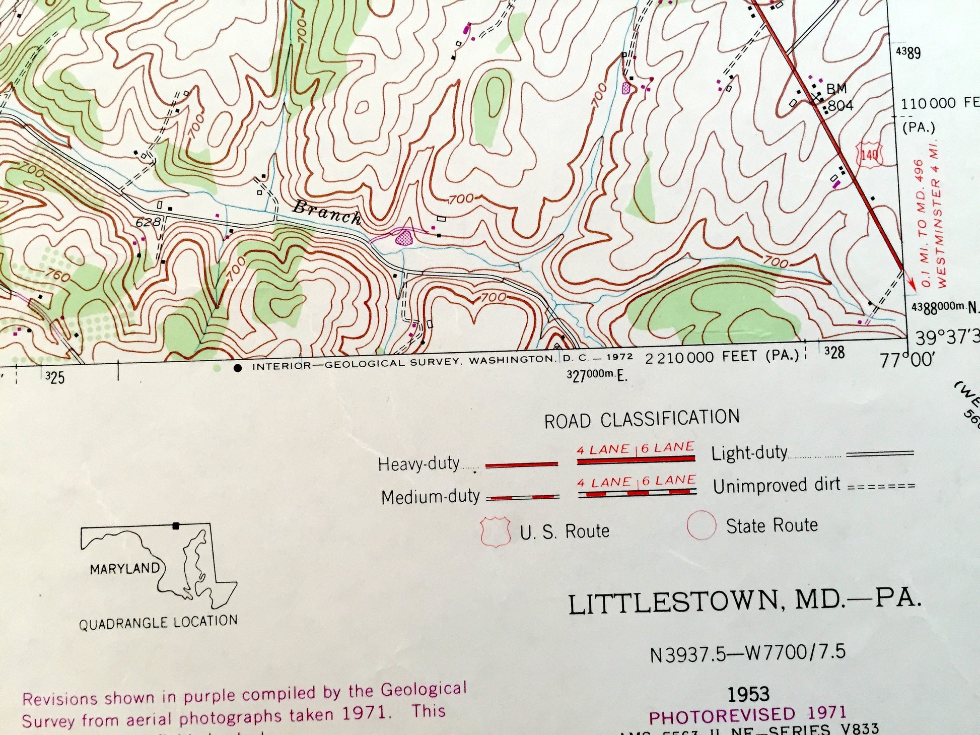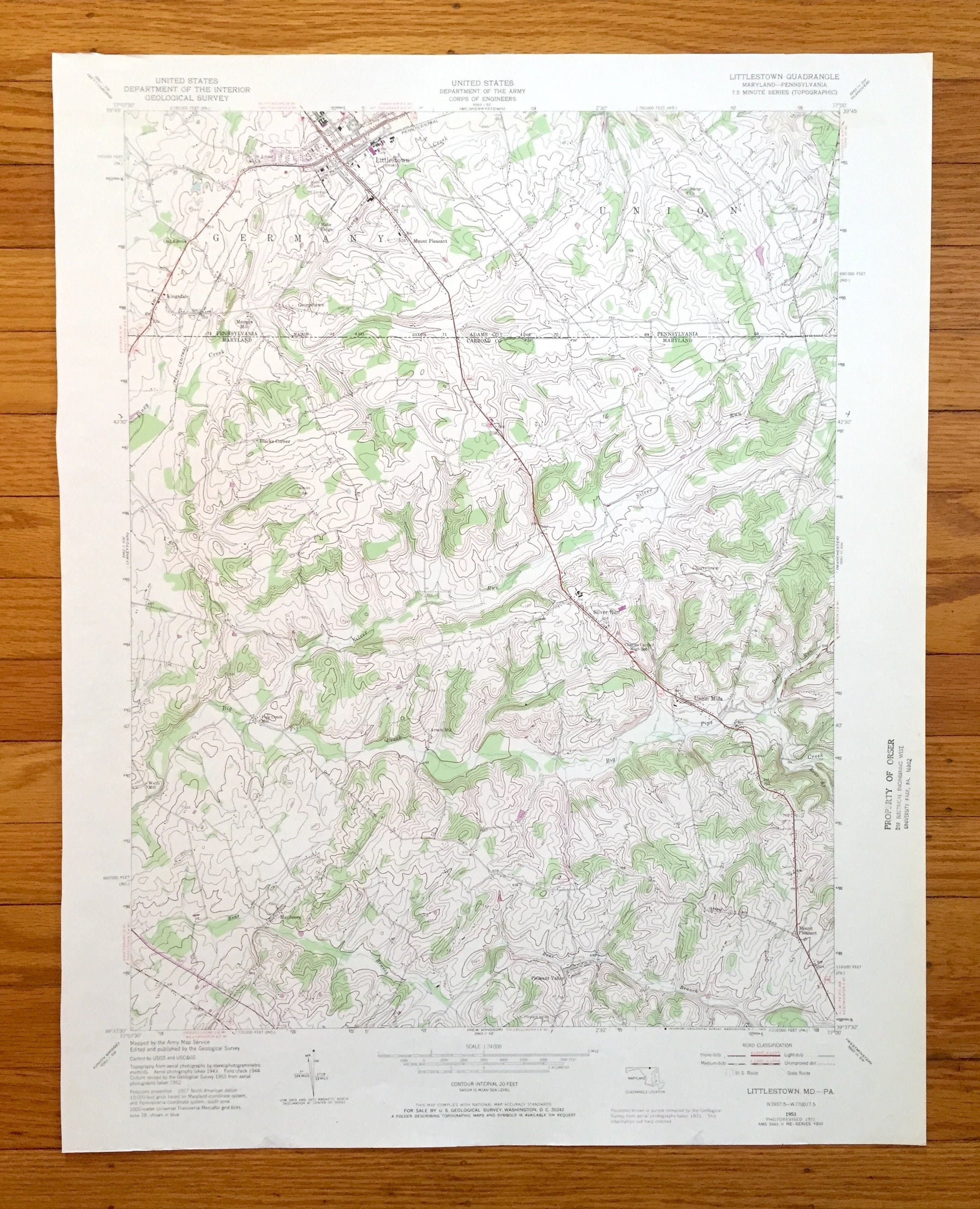 Beautiful, antique map of Littlestown, Pennsylvania and surrounding Adams County areas, including Maryland’s Carroll County. This is an authentic 1953 edition, 1972 print from the U.S. Geological Survey and NOT a computer reproduction.