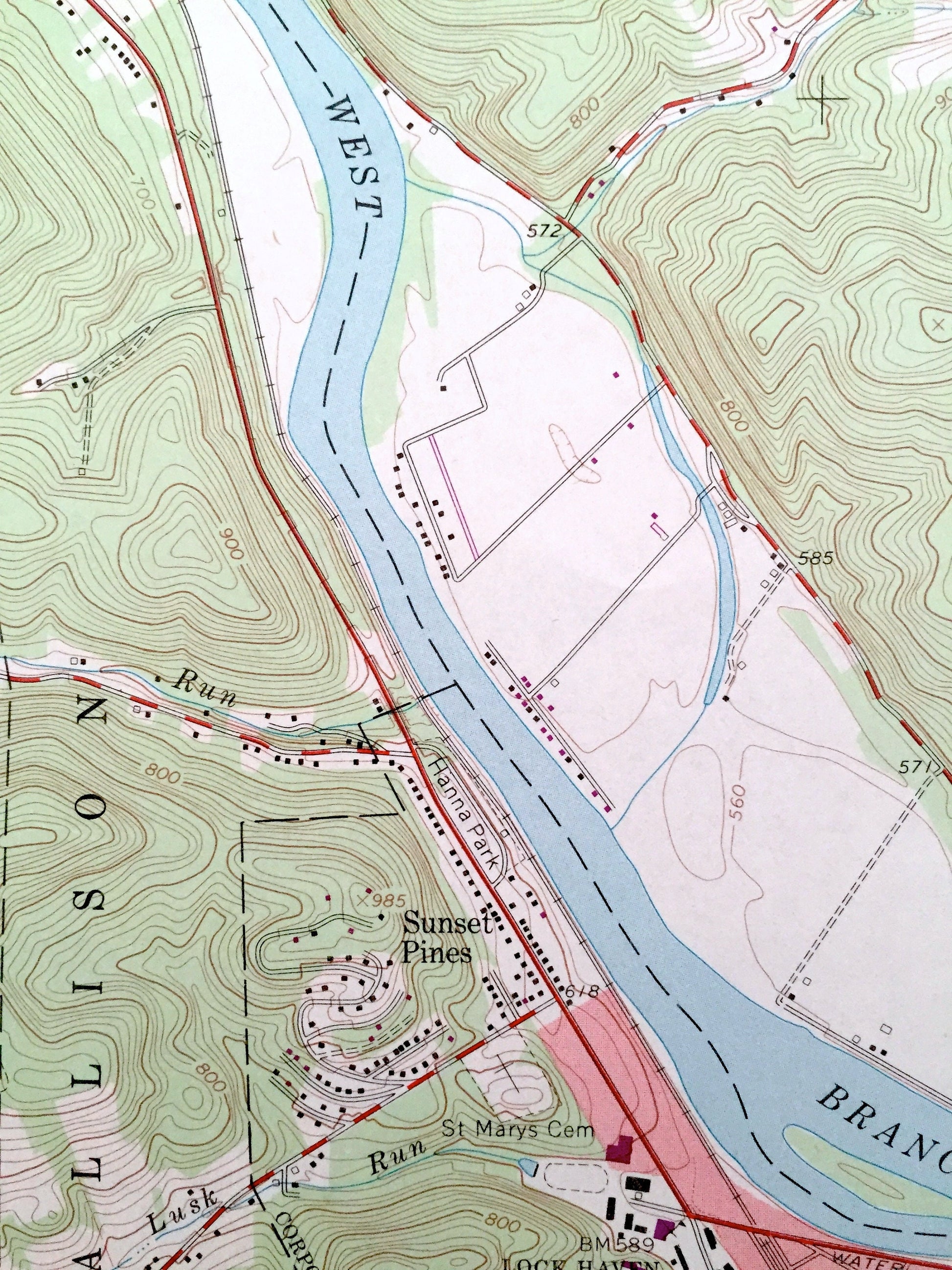 Points of Interest: West Branch Susquehanna River, Bald Eagle Creek, Bald Eagle State Forest, Bald Eagle Mountain, Penn Central Railroad, Great Island, Piper Memorial Airport, Lock Haven State College, Sugar Run, Radio Towers, Simcox Mountain, State Game Lands, Jeep Trails, Sproul State Forest, Cole Hill, Tiadaghton State Forest, Chatham Run, Ram Hollow Reservoir, Jerry Hollow Reservoir, and many more hills, streams, ponds, houses, schools, churches and roads.