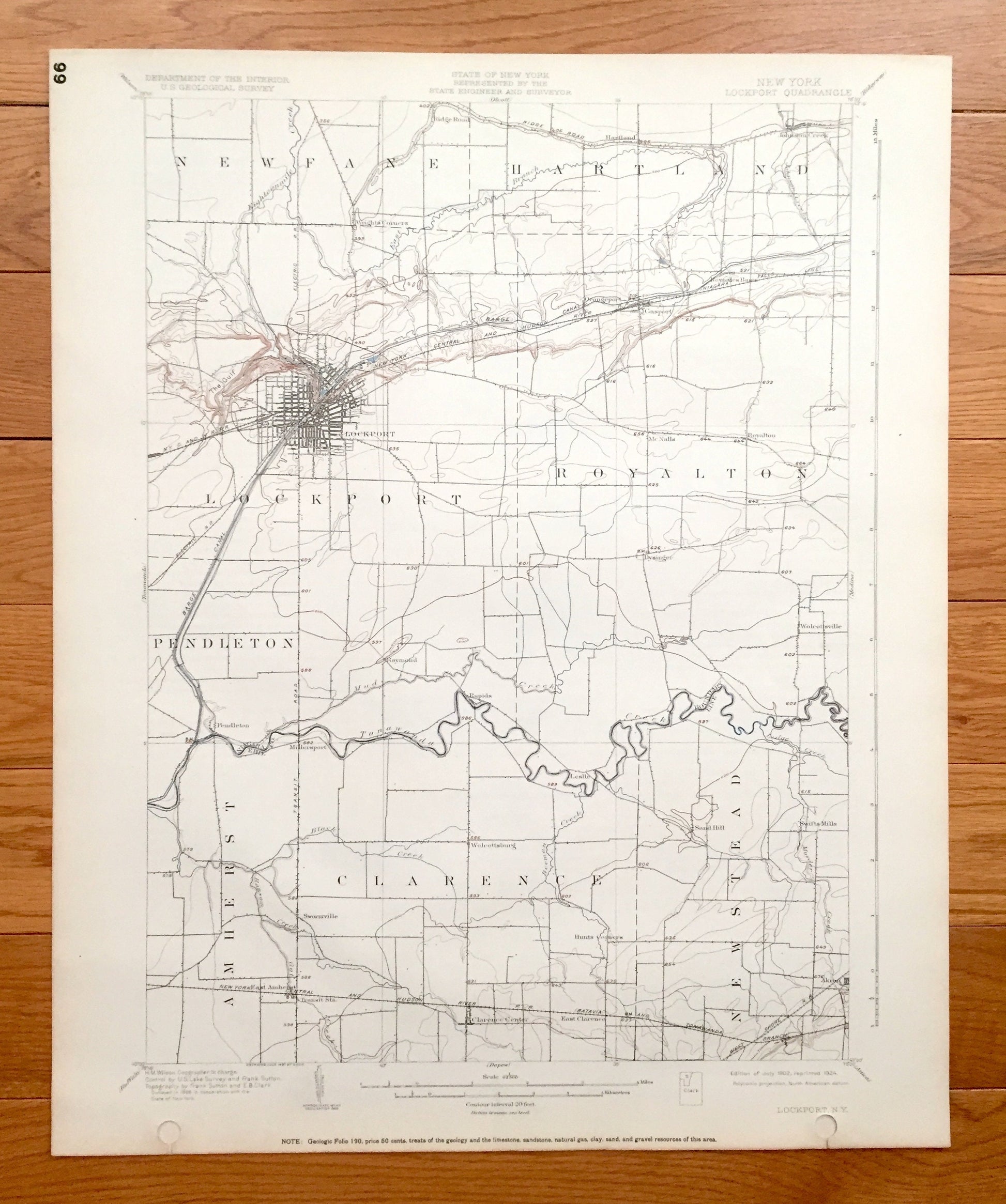 Beautiful, antique map of Lockport, New York and surrounding Niagara & Erie County areas. This is an authentic 1902 edition, 1924 print from the U.S. Geological Survey and NOT a computer reproduction.