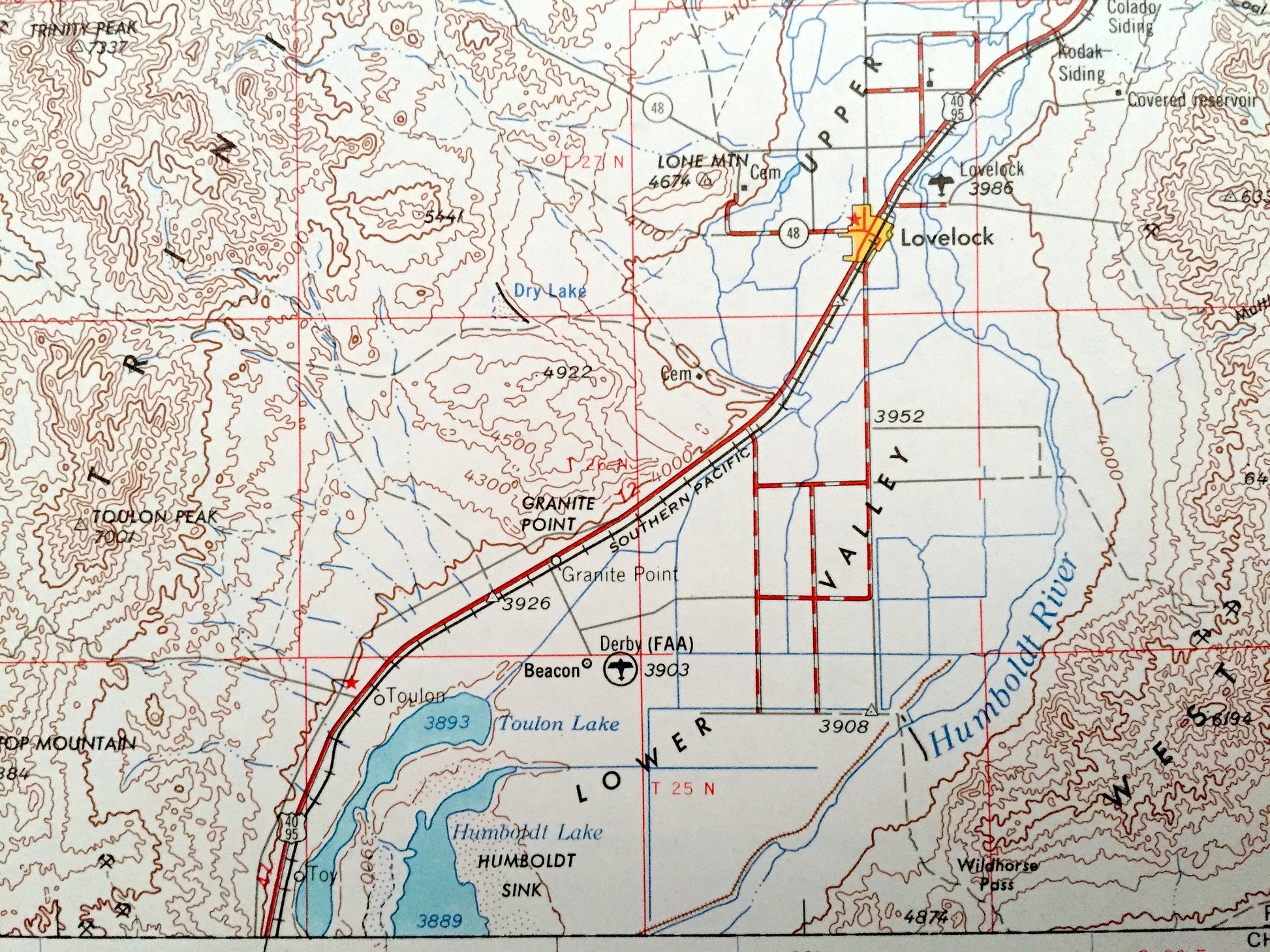 Points of Interest: Smoke Creek Desert, Black Rock Desert, Desert Valley, Upper Valley, Lower Valley, Antelope Valley, Granite Spring Valley, Granite Range, Fox Range, Selenite Range, Humboldt Range, Virginia Mountains, Shawave Mountains, Nightingale Mountains, US Naval Gunnery Range, Humboldt River, Pyramid Lake, Pyramid Lake Indian Reservation, Winnemucca Lake, Rye Patch Reservoir and Lassen County, California, and lots more hills, mountains, lakes, rivers, creeks, roads, highways and railroads.
