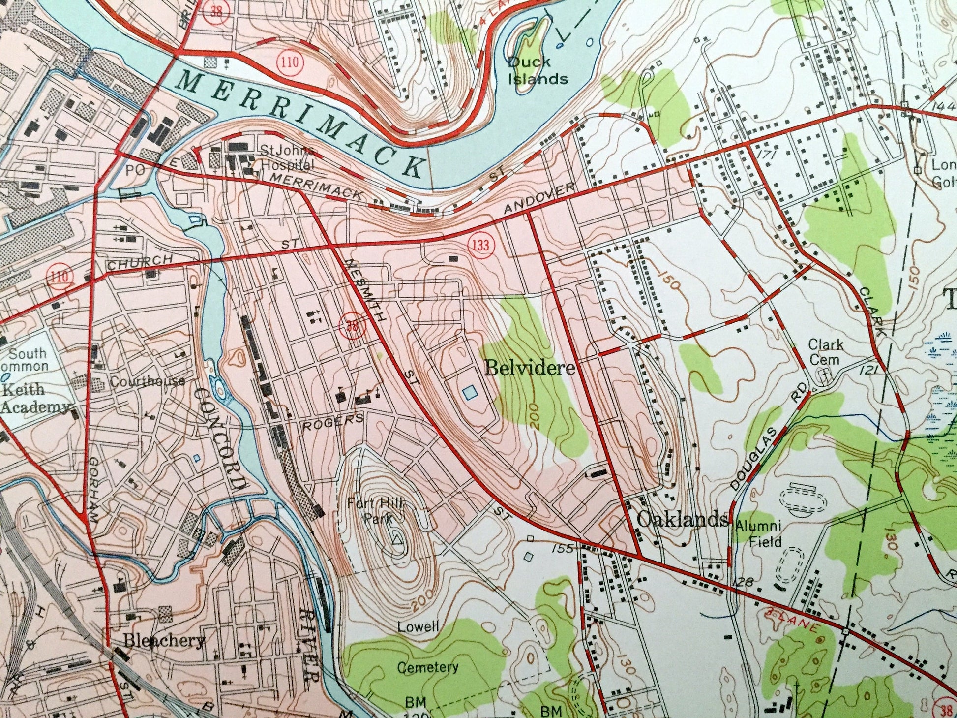 Points of Interest: Lowell-Dracut State Forest, Shedd Park, Cambridge Hill, Seaver Hill, Pulpit Rock, Gage Hill, Poplar Hill, Marsh Hill, Bump Hill, Gumpas Pond, Little Island Pond, Harris Pond, Long Pond, Merrimack River, Beaver Brook, Concord River, Trout Brook, Peppermint Brook, Golden Brook, Gumpas Pond Brook, and many more hills, streams, ponds, houses, schools, railroads, churches and roads.