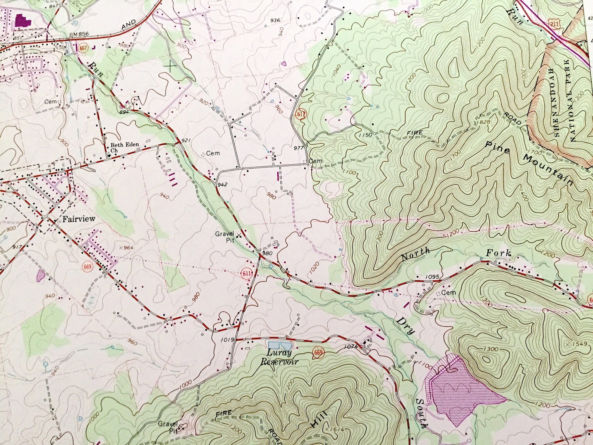Points of Interest: Shenandoah National Park, Luray Caverns, George Washington National Forest, South Fork Shenandoah River, Page Valley, Massanutten Mountain, Piney Hill, Pine Mountain, Three Sisters, Green Hollow, and many more hills, streams, ponds, houses, schools, churches and roads.