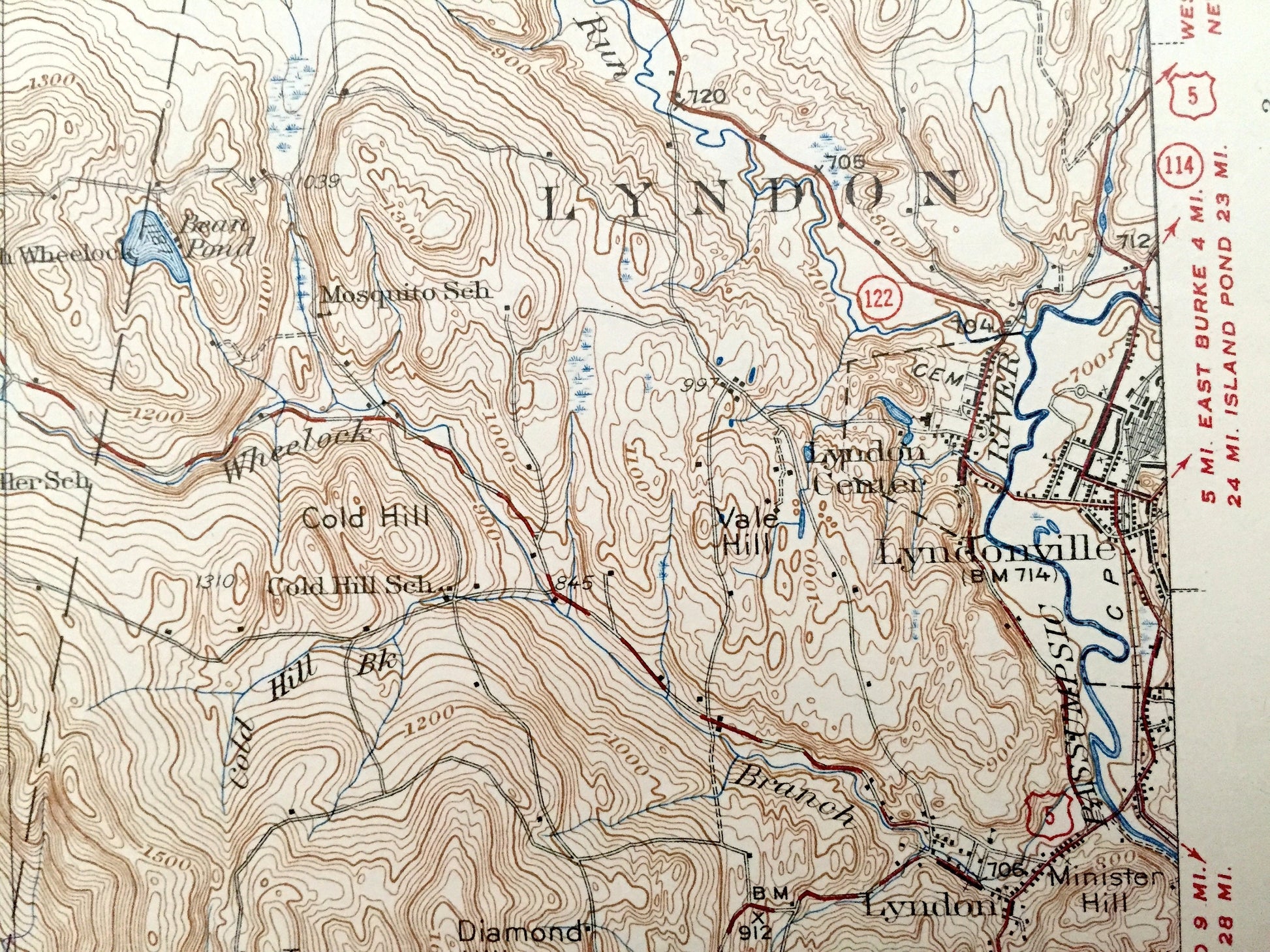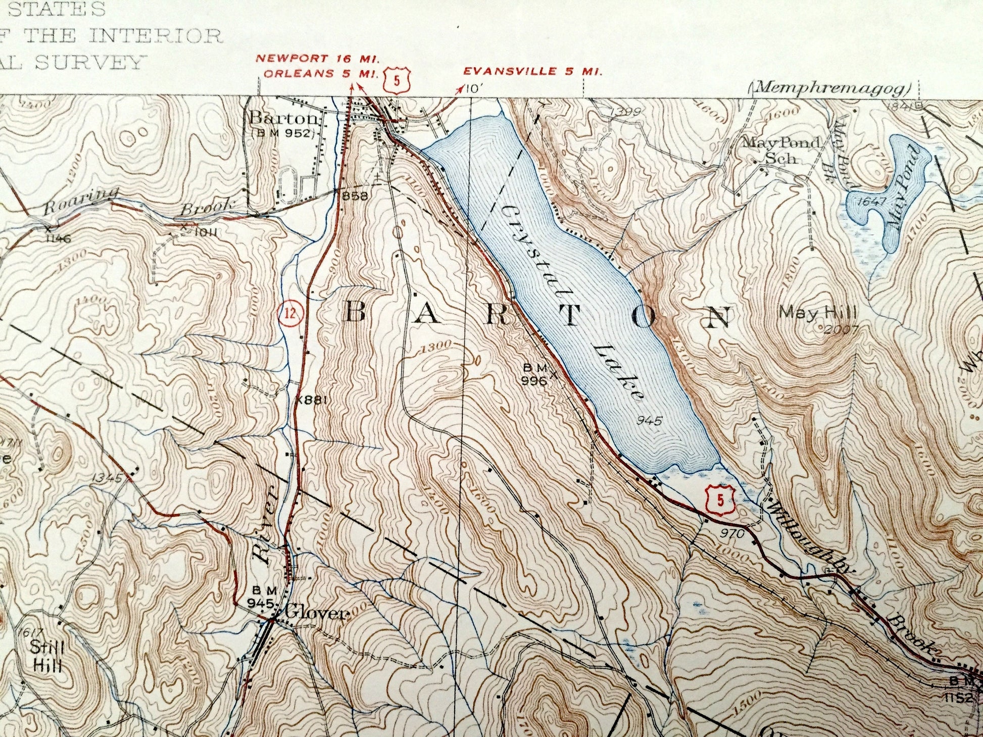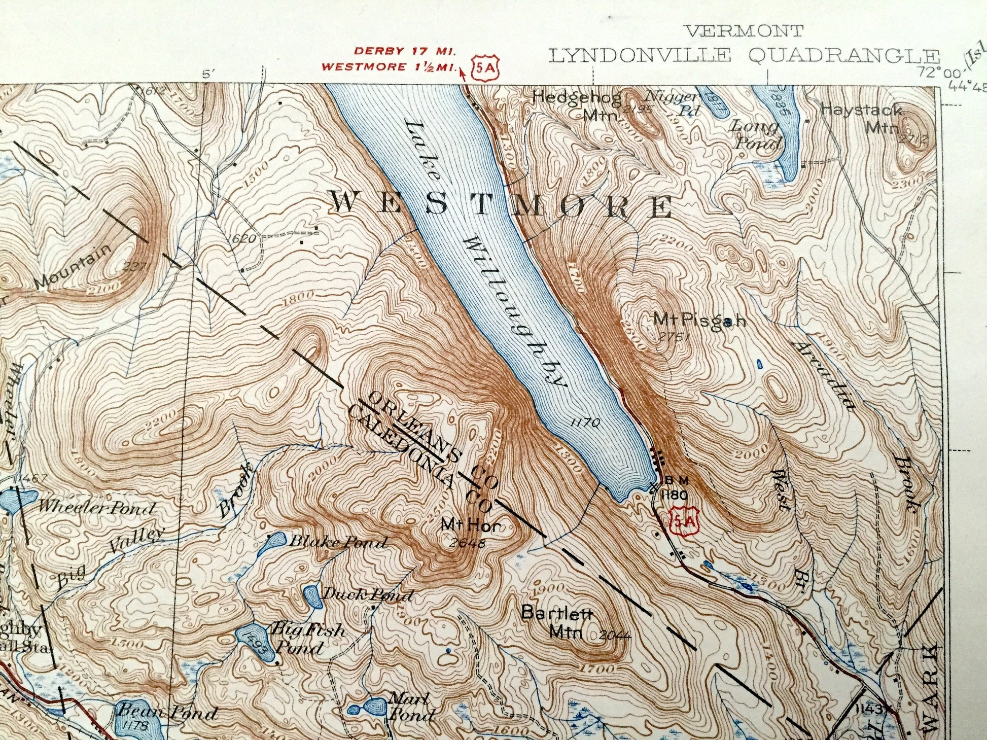 Points of Interest: Crystal Lake, Lake Willoughby, Mary Pond School, Kimball Station, Canadian Pacific Railroad, CCC Camp, Bartlett Mountain, Mt Pisgah, Heights School, Bickford School, Grays Mountain, Stratton Station, Mountain View School, Pudding Hill School, South Wheelock Church, Old Red School, Ide Mountain, Stannard Pond, Chandler Pond, Diamond Hill, Stannard Mountain, Coles Pond, Flagg Pond, Lower Stannard School, Horse Pond, North Greensboro School, Black Hills, Shadow Lake, Frost Mountain,Boston & Maine Railroad, and lots more hills, mountains, streams, ponds, houses, schools and roads.