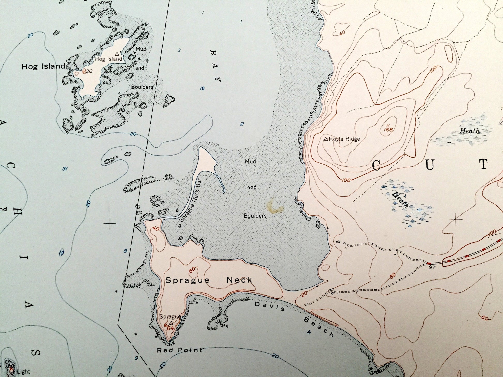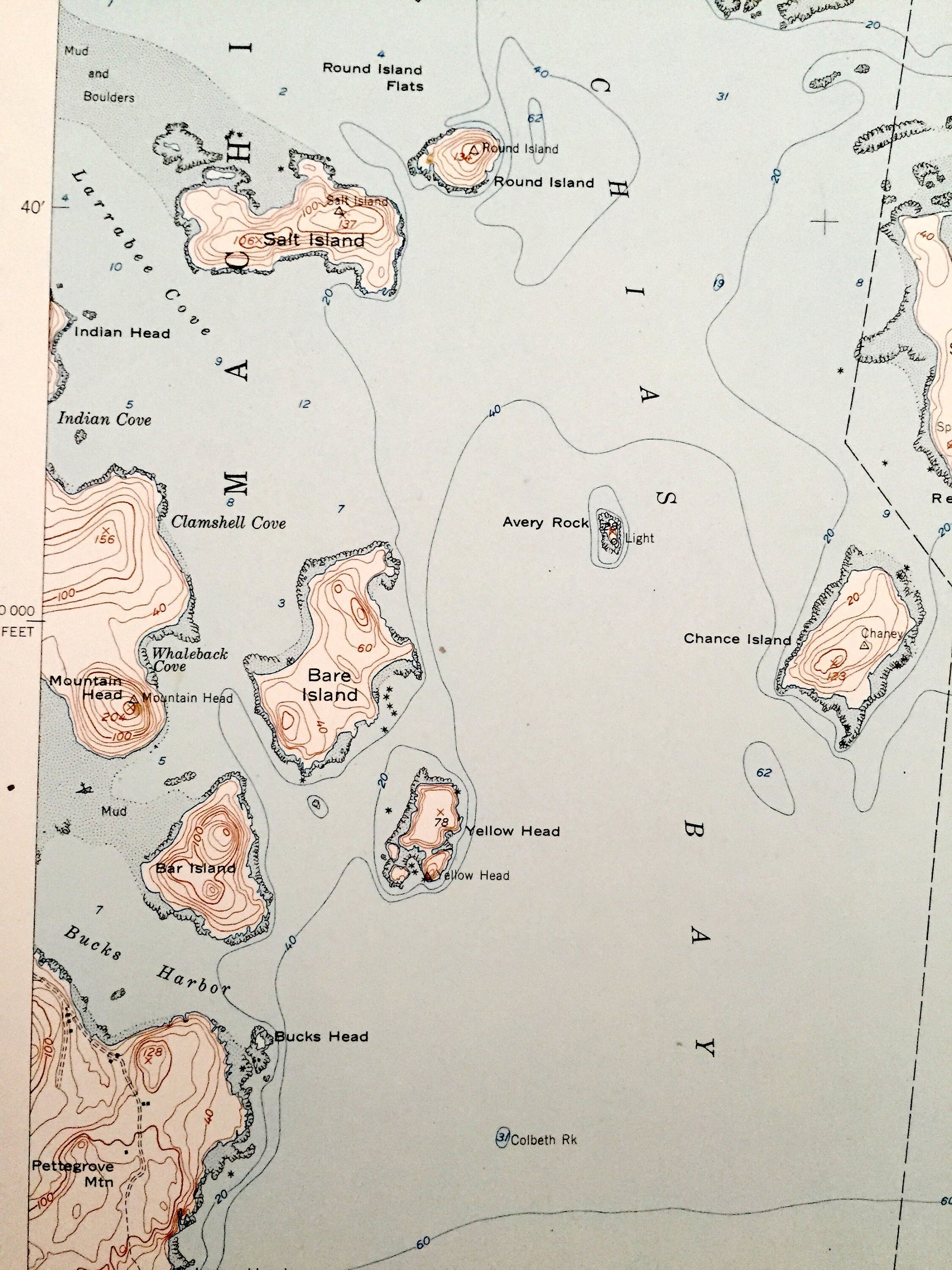 Points of Interest: Hog Island, Salt Island, Bare Island, Pettegrove Mountain, Woodruff Mountain, Enoch Hill, Sprague Neck, Chance Island, Cape Wash, Gardner Lake, Holmes Pond, Indian Lake, Holmes Bay, Little Machias Bay, Larrabee Cove, Bucks Harbor, Davis Beach, Holmes Stream, and many more hills, streams, ponds, houses, schools, railroads, churches and roads.