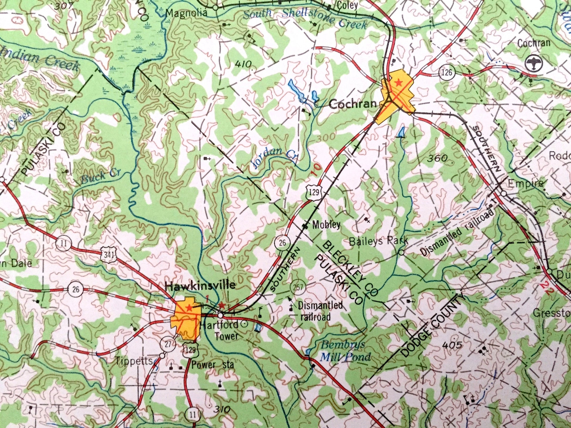 Points of Interest: Ocmulgee River, Oconee River, Ohoopee River, Ocmoglee State Park, Robins Air Force Base, Big Sandy Creek, Sugar Creek, Alligator Creek, Beaverdam Swamp and lots more hills, mountains, lakes, islands, bays, highways, railroads.