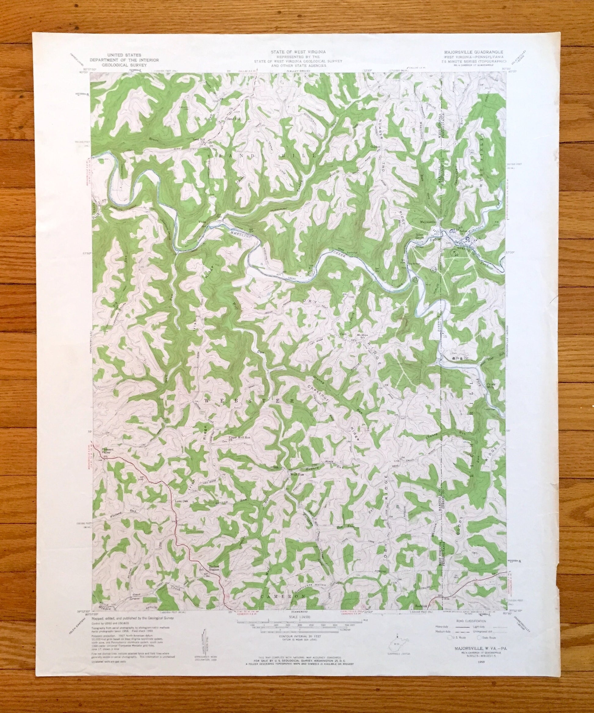 Beautiful, antique map of Majorsville, West Virginia and surrounding Marshall County area of the Northern Panhandle, including Pennsylvania. This is an authentic 1959 edition, 1961 print from the U.S. Geological Survey and NOT a computer reproduction.