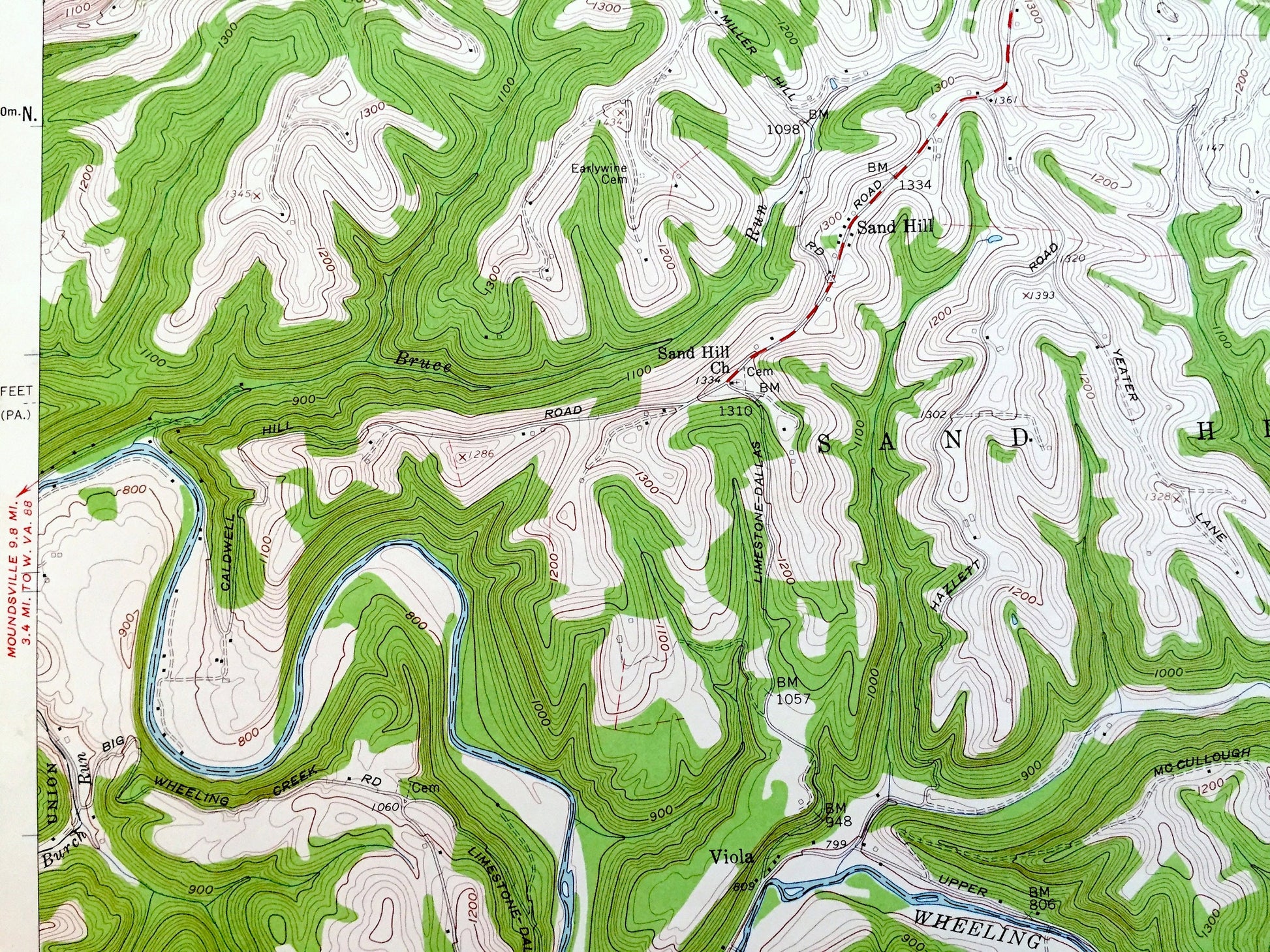 Points of Interest: Marshall County (WV), Greene County (PA), Washington County (PA), Middle Grave Creek, Whitney Run, Williams Run, Howard Run, Dodds Ridge, Irish Ridge, Chestnut Ridge, Granny Run, Wolf Run, Big Run, Burch Run, Bruce Run, Turkey Run, Number Two Ridge, Wheeling Creek, West Finley, Enlow Fork, Robinson Fork, Spottedtail Run, and many more parks, creeks, mountains, hills, valleys, schools, churches, houses, roads and train tracks.