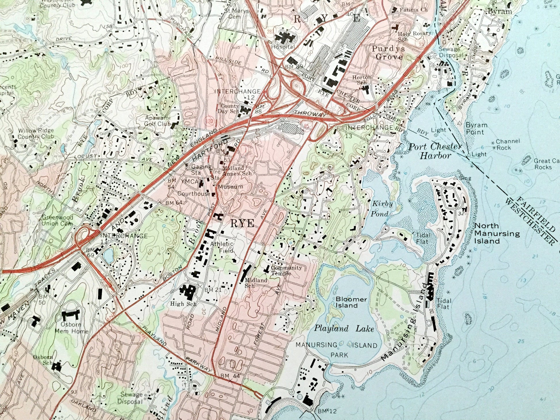 Points of Interest: Long Island Sound, Execution Rocks Lighthouse, East Beach, West Pond, Dosoris Island, Dosoris Pond, East Island, Hen and Chickens Reef, Larchmont Harbor, Satans Toe, Crab Island, Harbor Island Park, Mamaroneck Harbor, Peningo Neck, Porgy Shoal, Forbes Rocks, Transport Rock, Mamaroneck Reservoir, Saxon Woods Park, New York New Haven and Hartford Railroad, Playland Lake, Manursing Island Park, Great Captain Island, Port Chester Harbor, Calf Islands, Willow Ridge Country Club, Kirby Pond, and many more hills, streams, ponds, houses, schools, churches and roads.