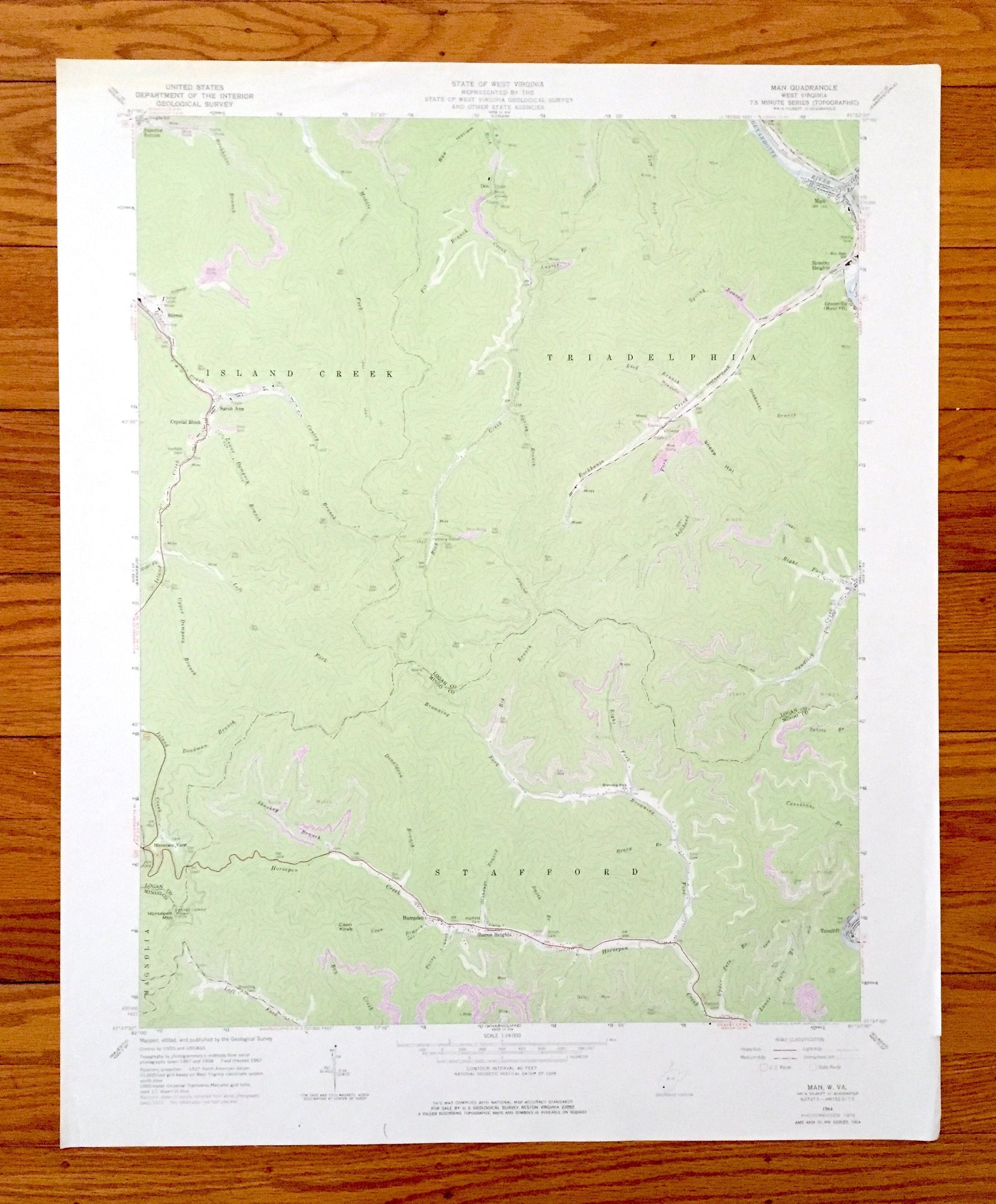 Beautiful, antique map of Man, West Virginia and surrounding Logan and Mingo County area. This is an authentic 1963 edition, 1977 print from the U.S. Geological Survey and NOT a computer reproduction.