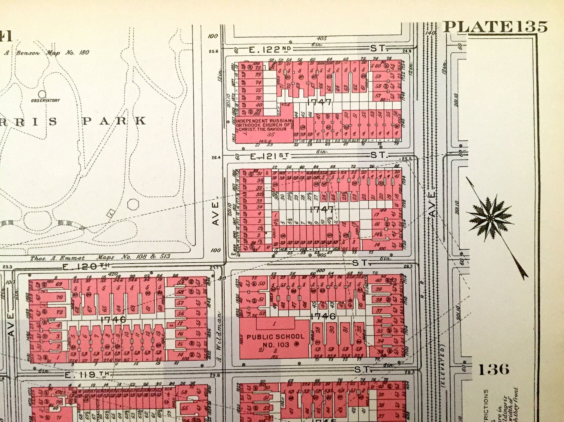 Antique Manhattan, New York City Map from Bromley's 1934 Manhattan Land Book – Harlem, Marcus Garvey Park, Mount Morris Park, Harlem NYC NY