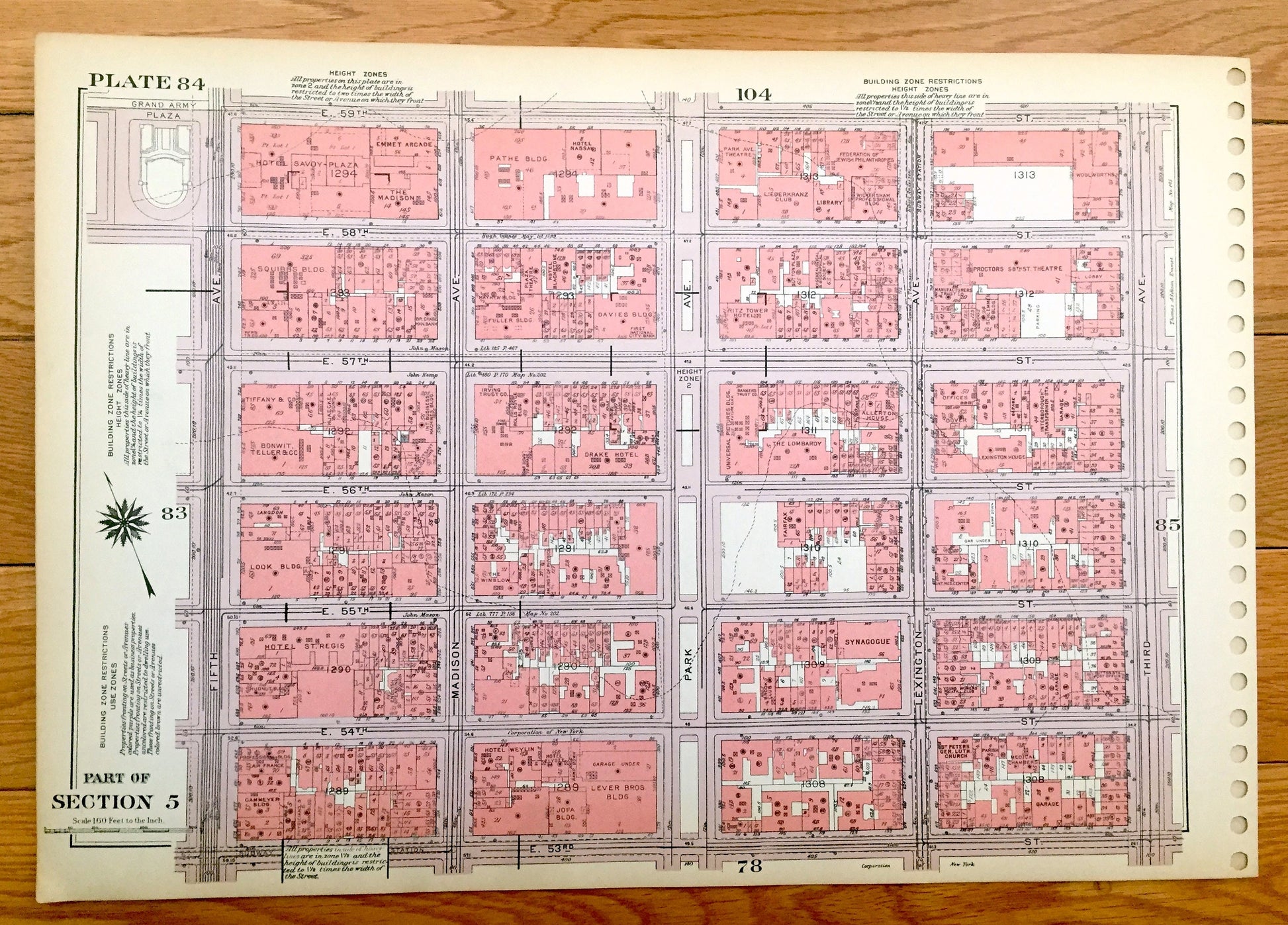 Beautiful, antique, double-sided map of Manhattan, taken from the rare "Manhattan Land Book of the City of New York" published in 1955 by G.W. Bromley & Company. This is an authentic print and NOT a computer reproduction. Includes Plates #83 and #84 from the atlas.