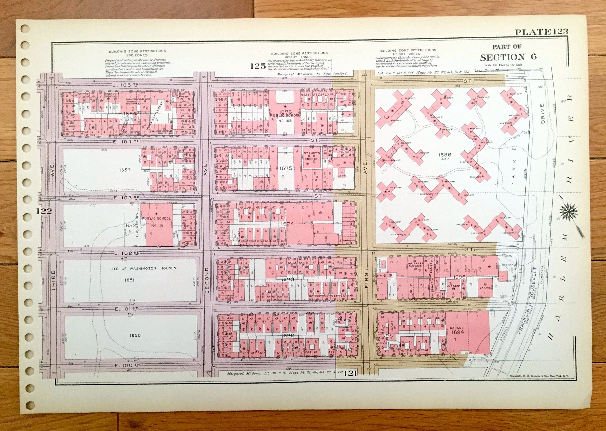 Antique Manhattan, New York City Map from Bromley's 1955 Manhattan Land Book – Harlem, Upper East Side, Central Park, Frawley Circle, NYC NY